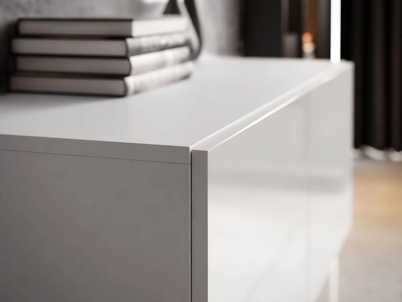 Korpus des TV-Schranks aus strapazierfähiger laminierter Platte sorgt für Langlebigkeit, während die elegante Oberfläche dem Ganzen einen modernen Charakter verleiht. Fronten wurden mit ABS-kanten und Acryl versehen, die ihre Widerstandsfähigkeit gegen Beschädigungen erhöhen und die Ästhetik des Möbels unterstreichen. Dank der eingesetzten Dämpfer und des Push-to-Open-Systems lassen sie sich leicht und sanft öffnen – sowohl nach oben als auch nach unten – und bewahren dabei ein modernes, einheitliches Erscheinungsbild. Die breite Oberplatte des Schranks bietet den idealen Platz für RTV-Geräte, Dekorationen oder Beleuchtung.