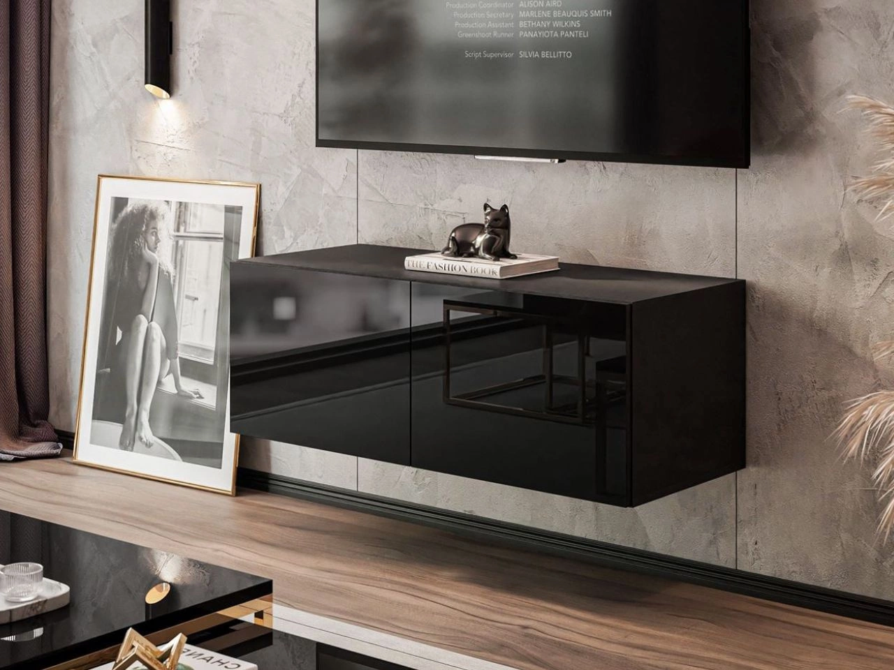 Hängende Ausführung des TV-Schranks erleichtert nicht nur die Reinigung, sondern schafft auch zusätzlichen Platz unter dem Möbelstück und betont seinen modernen, funktionalen Charakter.