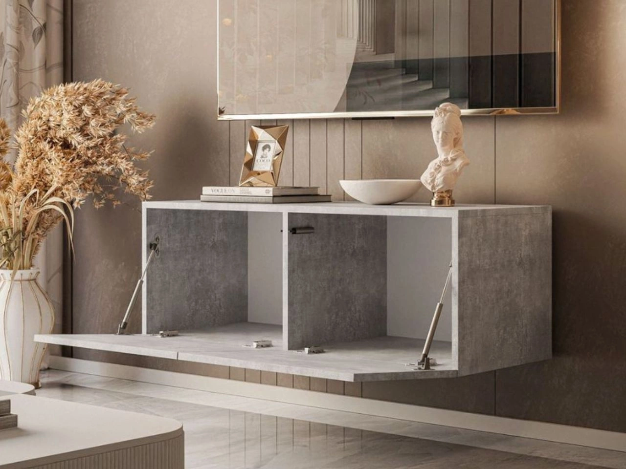 Suchen Sie ein modernes TV-Lowboard, das Ihrem Wohnzimmer Eleganz und Funktionalität verleiht? Modell Nodoo in der Ausführung beton belatto ist die ideale Lösung für alle, die Schlichtheit, praktische Details und ein designorientiertes Erscheinungsbild schätzen. Die minimalistische Form und die glatten Fronten fügen sich perfekt in industrielle, moderne oder glamouröse Einrichtungen ein.