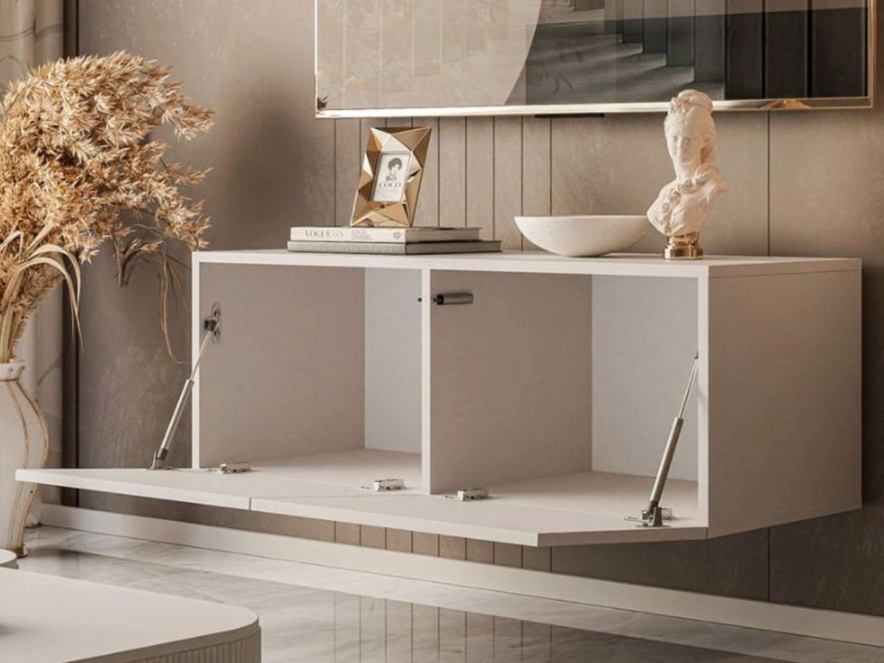 Korpus des TV-Schranks aus strapazierfähiger laminierter Platte sorgt für Langlebigkeit, während die elegante Oberfläche dem Ganzen einen modernen Charakter verleiht. Die Fronten wurden mit ABS-Kanten versehen, die ihre Widerstandsfähigkeit gegen Beschädigungen erhöhen und die Ästhetik des Möbels unterstreichen. Dank der eingesetzten Dämpfer und des Push-to-Open-Systems lassen sie sich leicht und sanft öffnen – sowohl nach oben als auch nach unten – und bewahren dabei ein modernes, einheitliches Erscheinungsbild. Die breite Ablagefläche des Schranks bietet den idealen Platz für TV-Geräte, Dekorationen oder Beleuchtung.