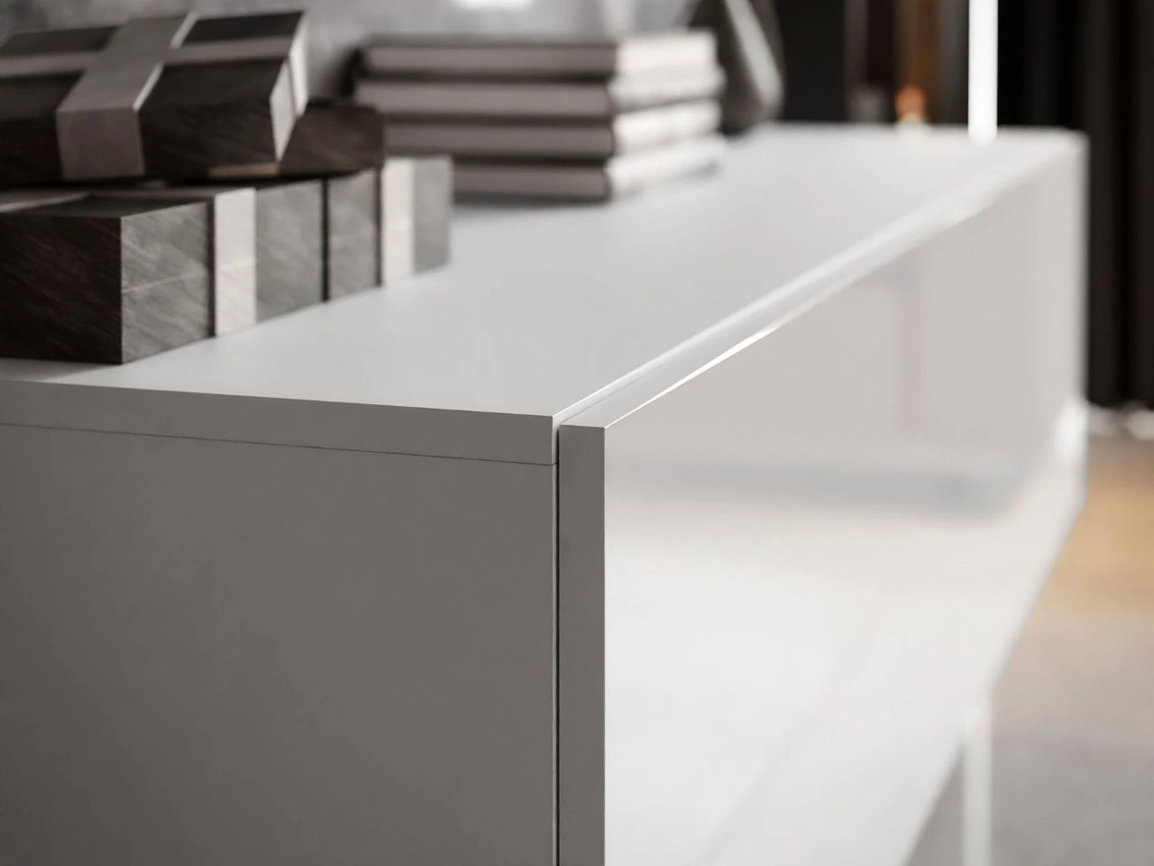 Korpus des TV-Schranks aus strapazierfähiger laminierter Platte sorgt für Langlebigkeit, während die elegante Oberfläche dem Ganzen einen modernen Charakter verleiht. Fronten wurden mit ABS-kanten und Acryl versehen, die ihre Widerstandsfähigkeit gegen Beschädigungen erhöhen und die Ästhetik des Möbels unterstreichen. Dank der eingesetzten Dämpfer und des Push-to-Open-Systems lassen sie sich leicht und sanft öffnen – sowohl nach oben als auch nach unten – und bewahren dabei ein modernes, einheitliches Erscheinungsbild. Die breite Oberplatte des Schranks bietet den idealen Platz für RTV-Geräte, Dekorationen oder Beleuchtung.