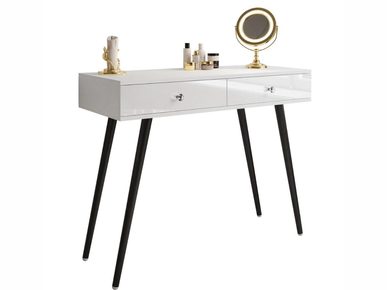 Die weiße Konsole mit schwarzen Beinen Olivine überzeugt mit einem reduzierten, modernen Design. Die Fronten bestehen aus laminierter Platte in Hochglanz, während der Korpus in dezentem Matt gehalten ist. Zwei Schubladen bewegen sich auf Kugelführungen mit Vollauszug und lassen sich über Kristallgriffe komfortabel öffnen.