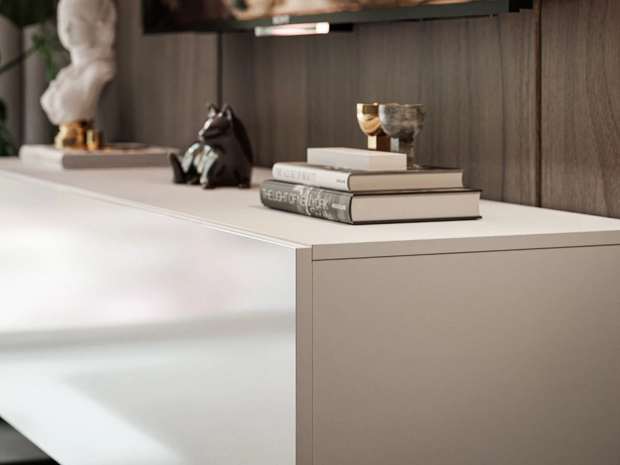 Korpus des TV-Schranks aus strapazierfähiger laminierter Platte sorgt für Langlebigkeit, während die elegante Oberfläche dem Ganzen einen modernen Charakter verleiht. Fronten wurden mit ABS-kanten und Acryl versehen, die ihre Widerstandsfähigkeit gegen Beschädigungen erhöhen und die Ästhetik des Möbels unterstreichen. Dank der eingesetzten Dämpfer und des Push-to-Open-Systems lassen sie sich leicht und sanft öffnen – sowohl nach oben als auch nach unten – und bewahren dabei ein modernes, einheitliches Erscheinungsbild. Die breite Oberplatte des Schranks bietet den idealen Platz für RTV-Geräte, Dekorationen oder Beleuchtung.
