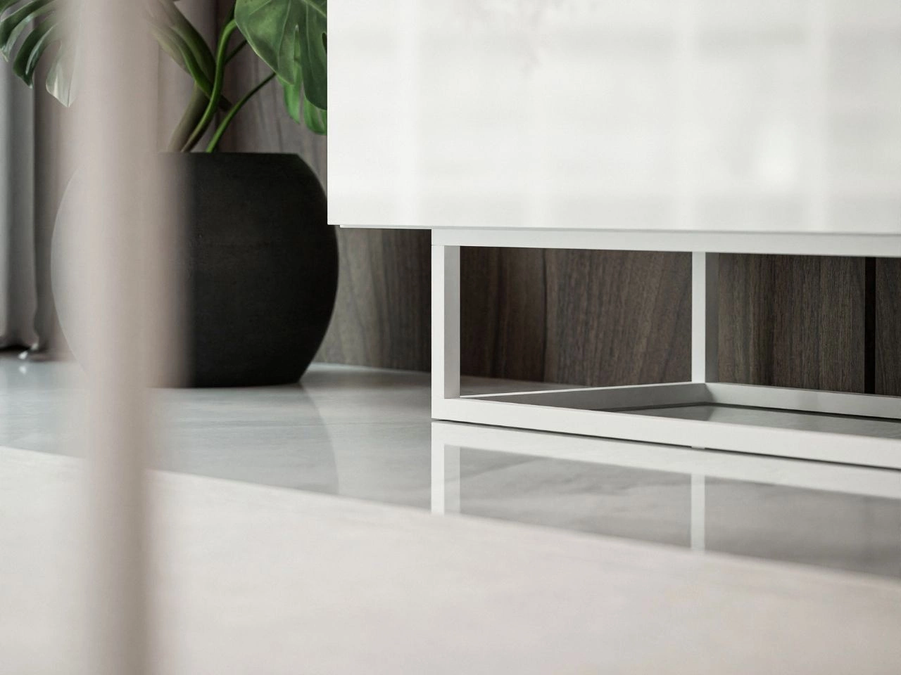 TV-Schrank teht auf einem robusten, pulverbeschichteten Metallgestell. Dadurch zeichnet es sich nicht nur durch eine hohe Beständigkeit gegen Korrosion, Hitze und mechanische Beschädigungen aus, sondern bietet auch praktische Vorteile – eine leichtere Reinigung des Raumes sowie die Möglichkeit, den Platz unter dem Möbelstück sinnvoll zu nutzen.
