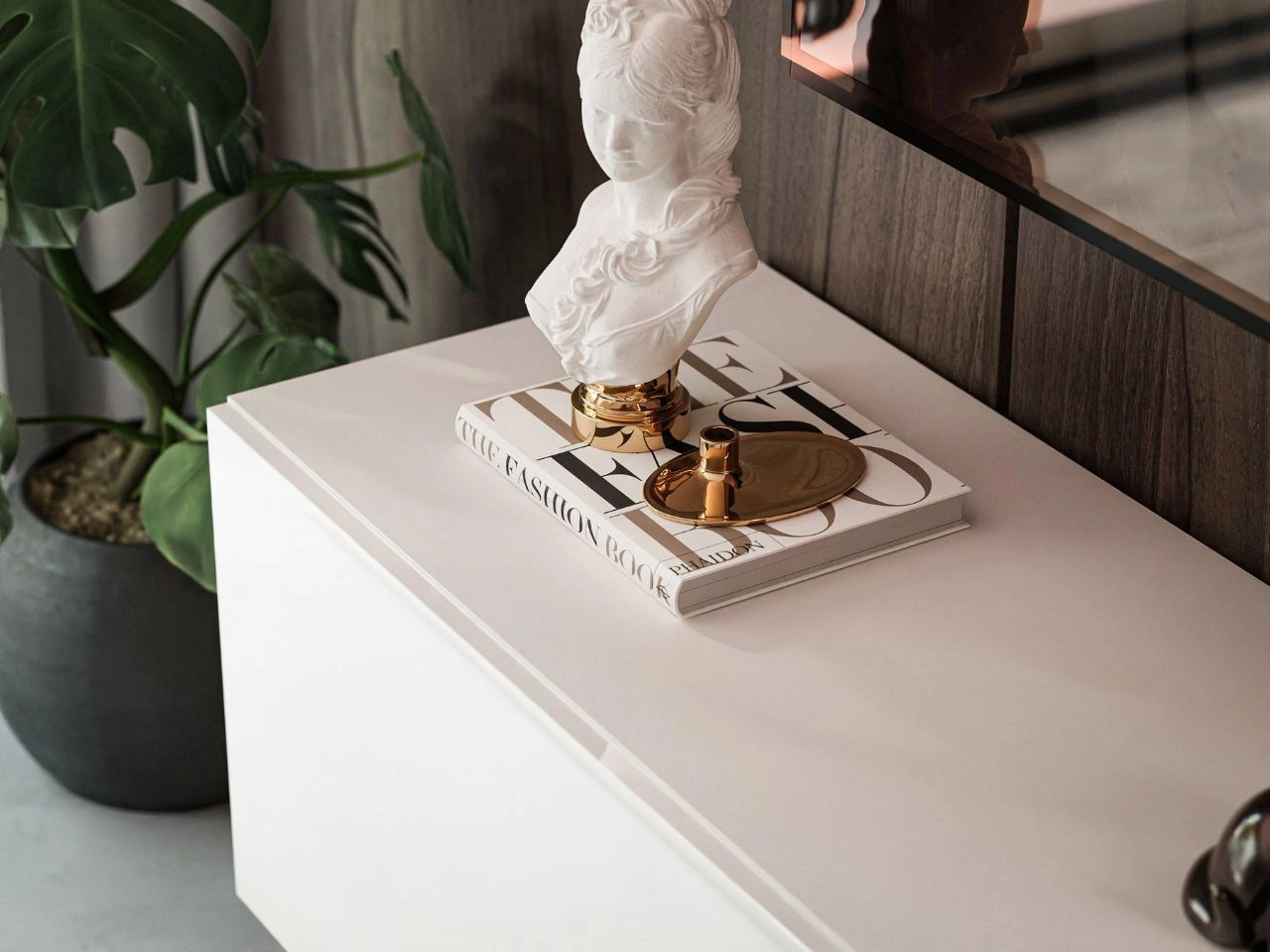Suchen Sie ein modernes TV-Lowboard, das Ihrem Wohnzimmer Eleganz und Funktionalität verleiht? Modell Nodoo in der Ausführung Weiß Hochglanz ist die ideale Lösung für alle, die Schlichtheit, praktische Details und ein designorientiertes Erscheinungsbild schätzen. Die minimalistische Form und die glatten Fronten fügen sich perfekt in industrielle, moderne oder glamouröse Einrichtungen ein.