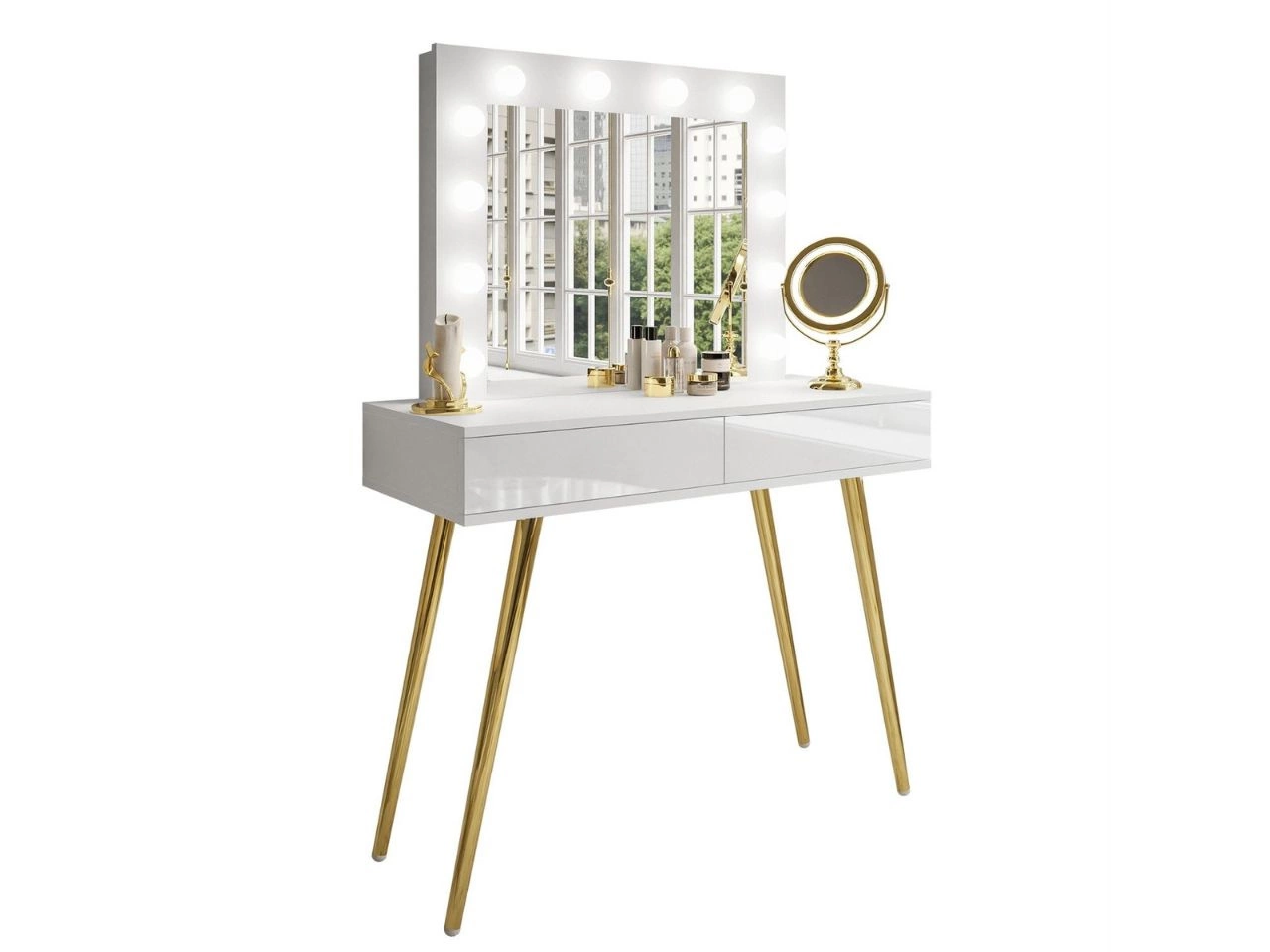 Der weiße Schminktisch Olivine mit Spiegel und LED ist sorgfältig verarbeitet und fügt sich mühelos in viele Einrichtungsstile ein. Korpus und Spiegelrahmen bestehen aus matter laminierter Platte, die Fronten sind in Weiß Hochglanz ausgeführt. Getragen wird die Konstruktion von goldenen Metallbeinen – optisch edel und stabil im Gebrauch.