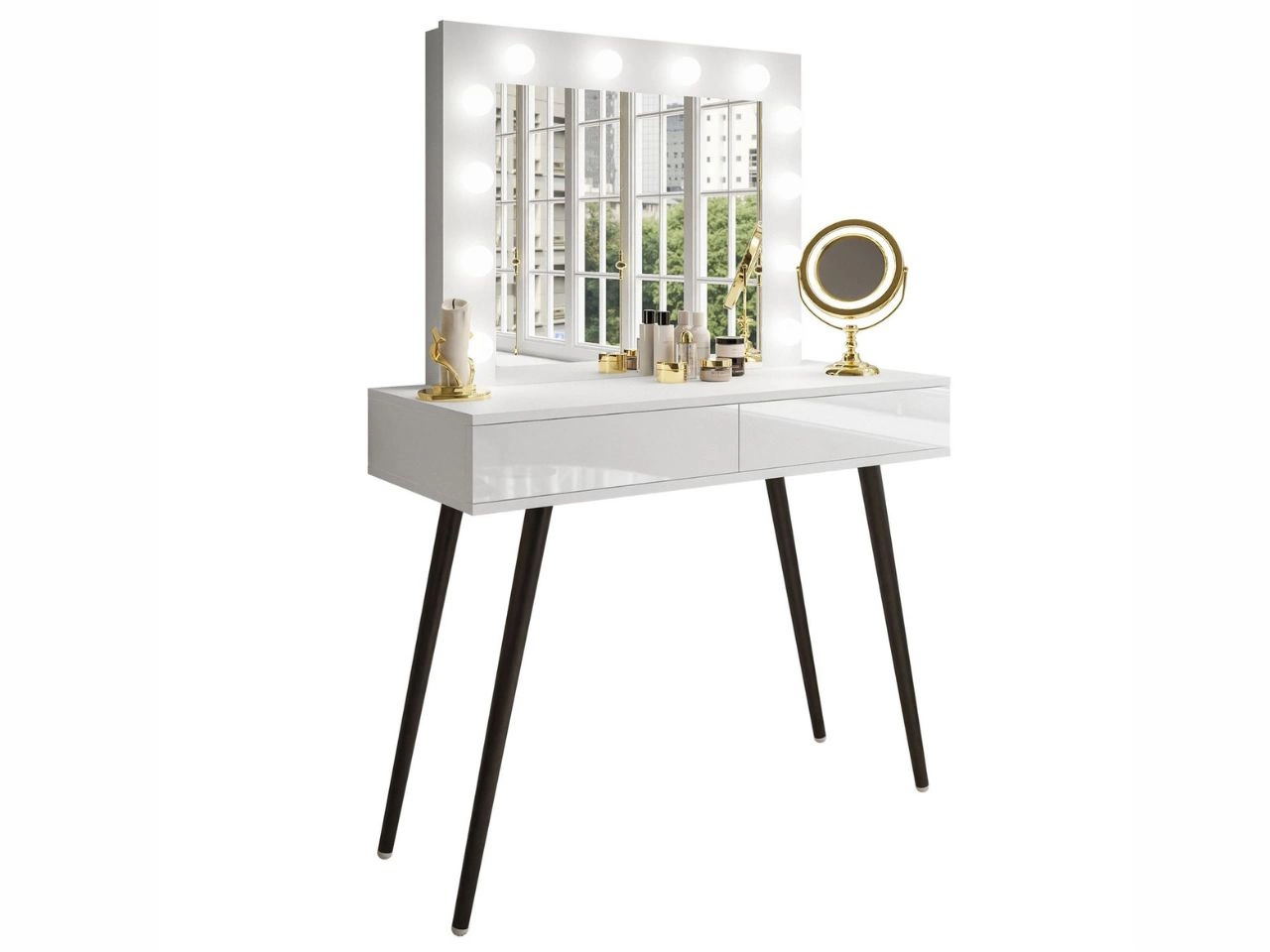 Schminktisch mit Schubladen, schwarzen Beinen und LED-Beleuchtung Olivine Weiß Hochglanz