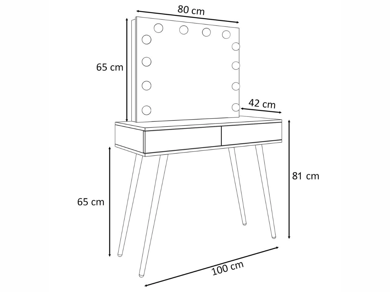 Die Funktionalität wird durch moderne Details unterstrichen: Der Spiegel wird von 12 LED-Lichtpunkten in natürlicher, augenfreundlicher Lichtfarbe erhellt; die Stromversorgung erfolgt über die Steckdose mit dem im Set enthaltenen Kabel. Außerdem verfügt das Möbel über zwei Schubladen mit PUSH-TO-OPEN – der Vollauszug auf kugelgelagerten Führungen ermöglicht einen bequemen Zugriff auf den Inhalt. Damit der Schminktisch Olivine Elite lange makellos bleibt, sind die Kanten mit ABS-Umleimer geschützt – widerstandsfähig gegen kleine mechanische Beschädigungen und Kratzer.