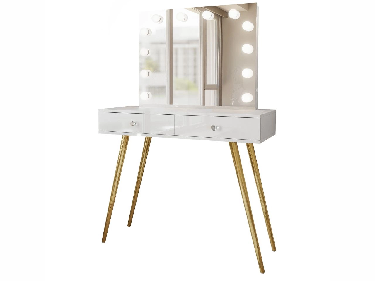 Der Schminktisch Olivine Elite in Weiß Hochglanz mit Spiegel und LED-Beleuchtung ist ein elegantes Möbelstück, das sich mühelos in unterschiedliche Einrichtungsstile einfügt. Korpus und Spiegelrahmen bestehen aus matter, laminierter Platte, die Fronten sind in Hochglanz ausgeführt. Die stabile Konstruktion steht auf goldfarbenen Metallbeinen, die dem Design Raffinesse verleihen und für Standfestigkeit sorgen.