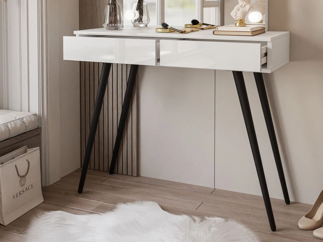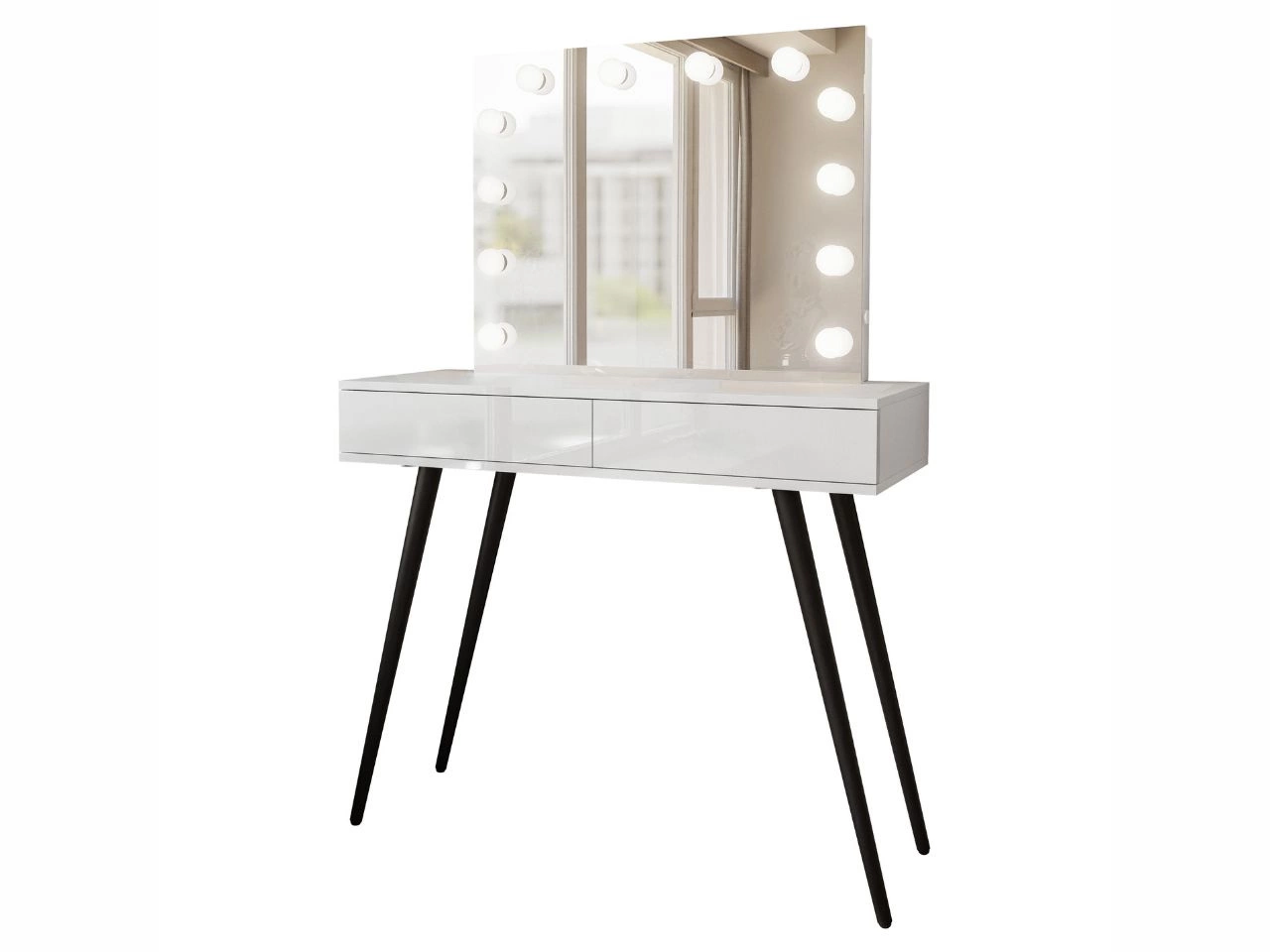 Schminktisch im Glamour-Stil mit schwarzen Beinen, Spiegel und LED-Beleuchtung Olivine Elite Weiß Hochglanz