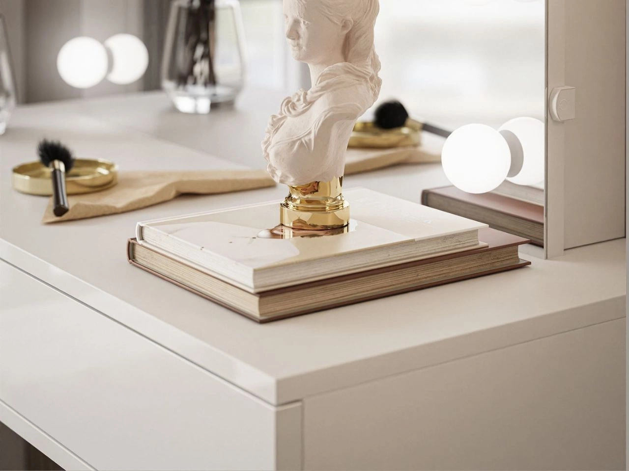 Die Funktionalität wird durch moderne Details unterstrichen: Der Spiegel wird von 12 LED-Lichtpunkten in natürlicher, augenfreundlicher Lichtfarbe erhellt; die Stromversorgung erfolgt über die Steckdose mit dem im Set enthaltenen Kabel. Außerdem verfügt das Möbel über zwei Schubladen mit PUSH-TO-OPEN – der Vollauszug auf kugelgelagerten Führungen ermöglicht einen bequemen Zugriff auf den Inhalt. Damit der Schminktisch Olivine Elite lange makellos bleibt, sind die Kanten mit ABS-Umleimer geschützt – widerstandsfähig gegen kleine mechanische Beschädigungen und Kratzer.