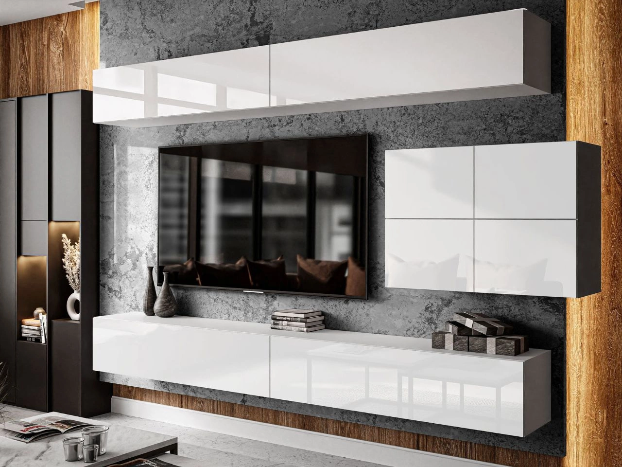 Wohnwand mit TV-Lowboard bietet viel Stauraum dank einer praktischen Aufteilung. Sowohl der obere als auch der untere Teil der Wohnwand sind in vier geräumige Fächer unterteilt, die viel Platz für TV-Zubehör, Bücher oder Dekorationen bieten. Ergänzt wird das Set durch einen Seitenschrank mit vier Fronten, der zusätzlichen Stauraum schafft und den modernen Charakter der gesamten Konstruktion unterstreicht. Die Fronten in Hochglanz lassen den Raum optisch größer wirken und verleihen dem Möbelstück einen eleganten, modernen Charakter.