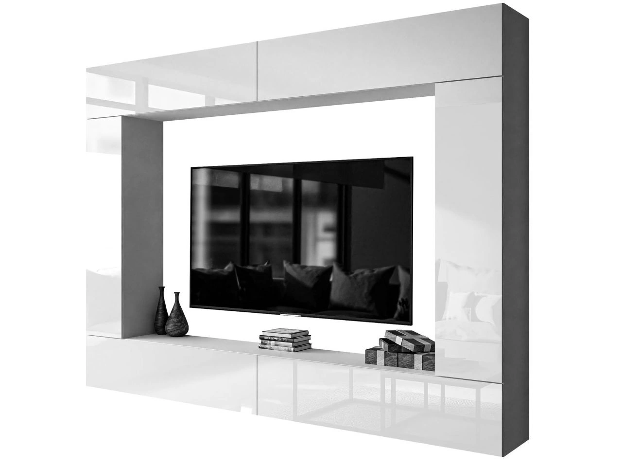 Wohnwand mit TV-Lowboard bietet eine enorme Funktionalität dank ihrer durchdachten Aufteilung – der obere Teil ist in vier Fächer unterteilt, der untere Bereich ebenfalls in vier weitere, und ergänzt wird das Ganze durch zwei hohe Seitenschränke mit zusätzlichen Ablagen, die noch mehr Stauraum bieten. Die Fronten in Hochglanz verleihen dem Möbelstück Eleganz, lassen den Raum optisch größer wirken und unterstreichen seinen modernen Charakter, sodass die gesamte Wohnwand perfekt in jedes zeitgemäße Wohnzimmer passt.