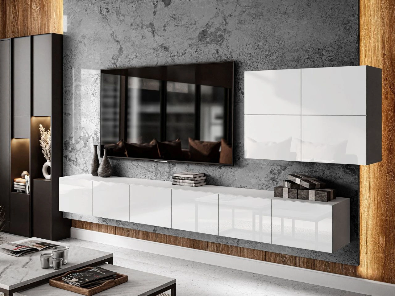Wohnwand mit TV-Lowboard zeichnet sich durch ihre Funktionalität und durchdachte Aufteilung aus – der untere Teil ist in vier geräumige Fächer unterteilt, ergänzt durch einen seitlichen Hängeschrank mit vier Fronten, der zusätzlichen Stauraum bietet. Die Fronten in Hochglanz verleihen dem Möbel Eleganz, lassen den Raum optisch größer wirken und betonen seinen modernen Charakter, sodass das Set ideal in jedes zeitgemäße Wohnzimmer passt.