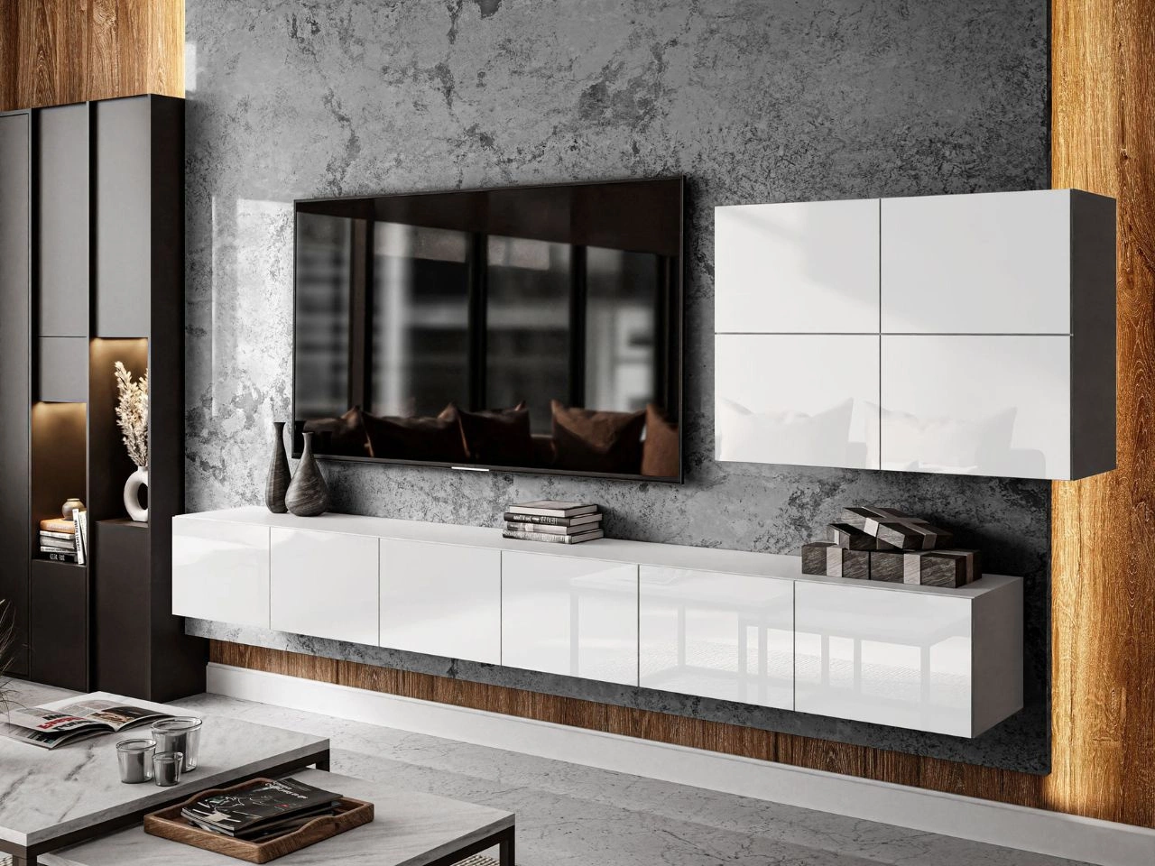 Wohnwand mit TV-Lowboard zeichnet sich durch ihre Funktionalität und durchdachte Aufteilung aus – der untere Teil ist in vier geräumige Fächer unterteilt, ergänzt durch einen seitlichen Hängeschrank mit vier Fronten, der zusätzlichen Stauraum bietet. Die Fronten in Hochglanz verleihen dem Möbel Eleganz, lassen den Raum optisch größer wirken und betonen seinen modernen Charakter, sodass das Set ideal in jedes zeitgemäße Wohnzimmer passt.