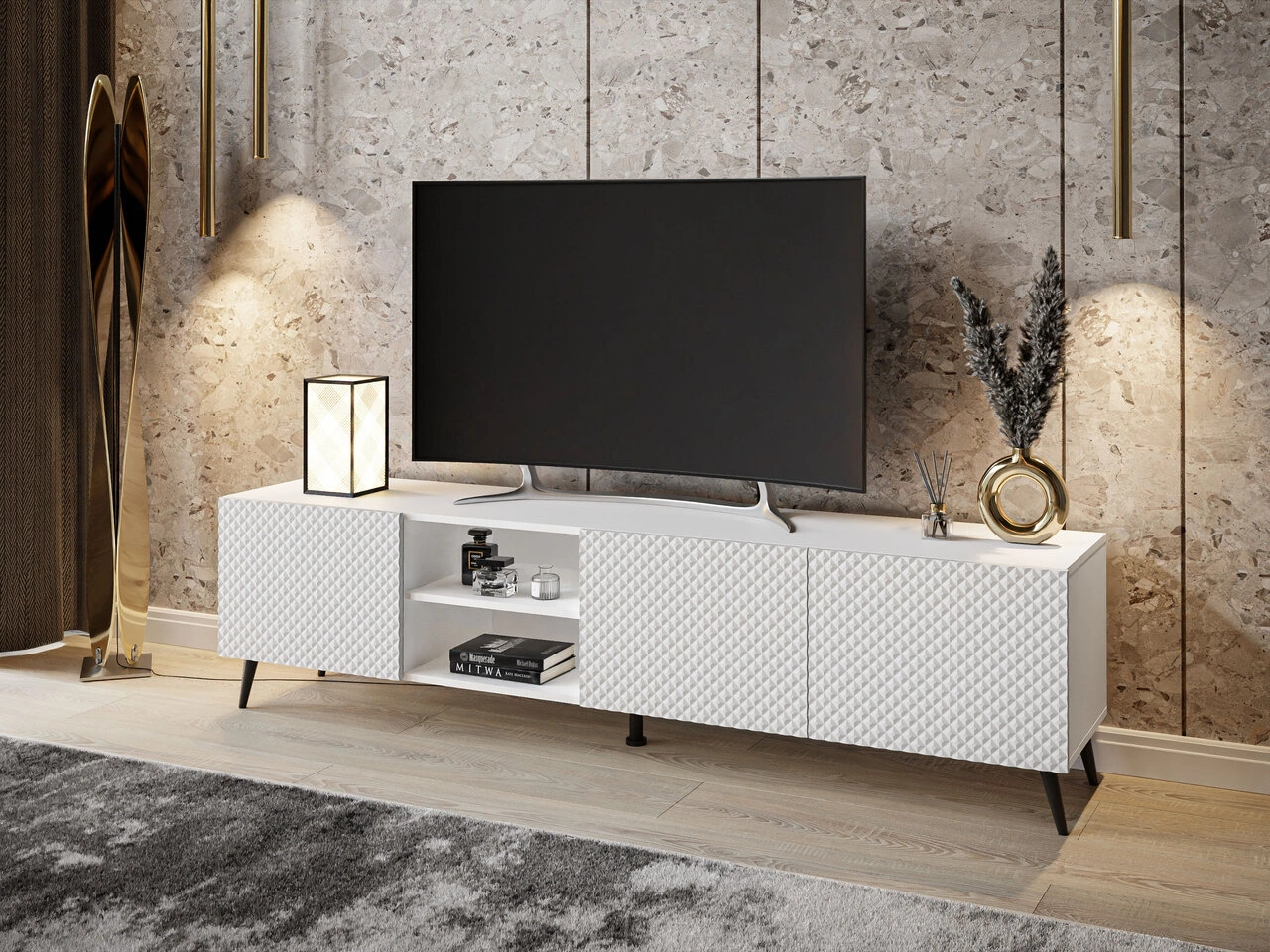 TV-Schrank mit 3D-gefrästen Fronten und schwarzen Metallbeinen Celiane Weiß Glanz