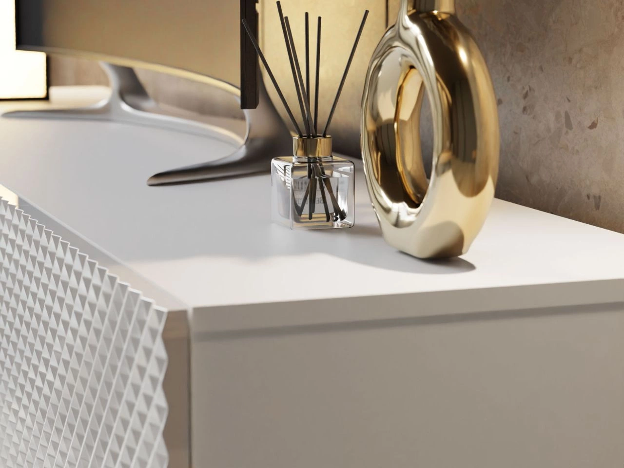 TV-Schrank mit 3D-gefrästen Fronten und goldenen Metallbeinen Celiane Weiß Glanz