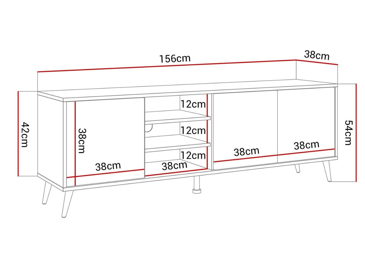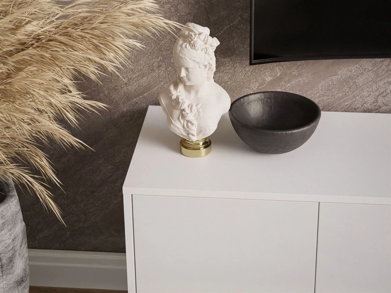 Das TV-Möbel Vivance wird aus hochwertiger laminierter Platte gefertigt; die Kanten sind mit einer ABS-Kante geschützt, die vor feinen Kratzern und mechanischen Beschädigungen bewahrt. In der Rückwand befindet sich eine runde Öffnung als Kabeldurchführung für eine saubere Kabelführung. Die Fronten sind in Hochglanz ausgeführt, der Korpus in Matt. Das Ganze steht auf eleganten schwarzen Metallfüßen.