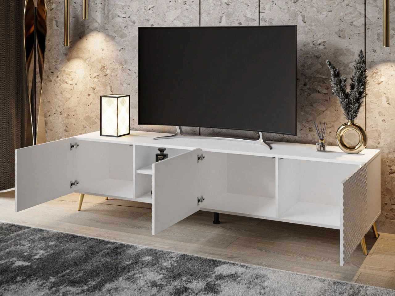 TV-Schrank mit 3D-gefrästen Fronten und verchromten Metallbeinen Celiane Weiß Glanz