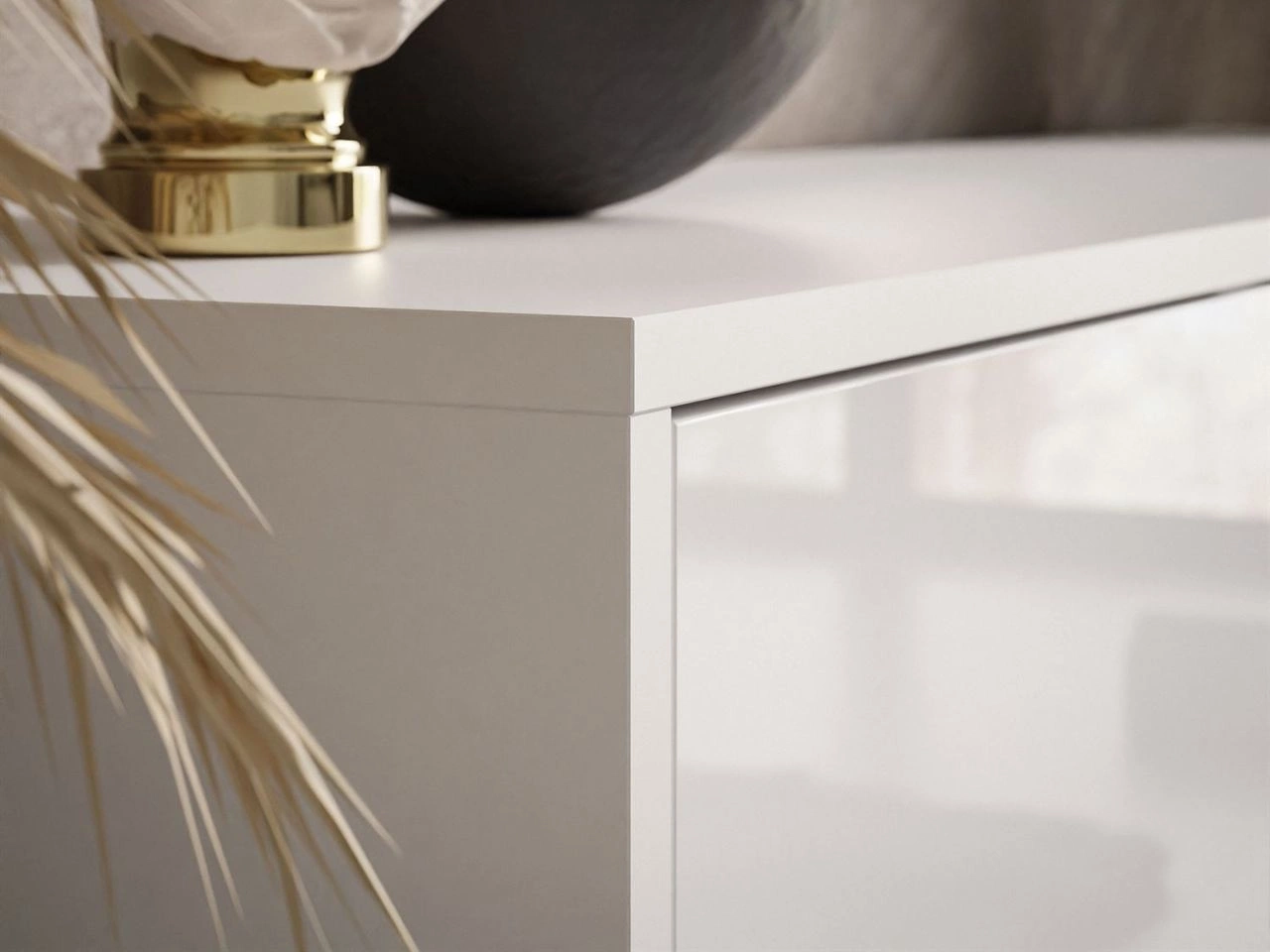 Das TV-Möbel Vivance wird aus hochwertiger laminierter Platte gefertigt; die Kanten sind mit einer ABS-Kante geschützt, die vor feinen Kratzern und mechanischen Beschädigungen bewahrt. In der Rückwand befindet sich eine runde Öffnung als Kabeldurchführung für eine saubere Kabelführung. Die Fronten sind in Hochglanz ausgeführt, der Korpus in Matt. Das Ganze steht auf eleganten schwarzen Metallfüßen.