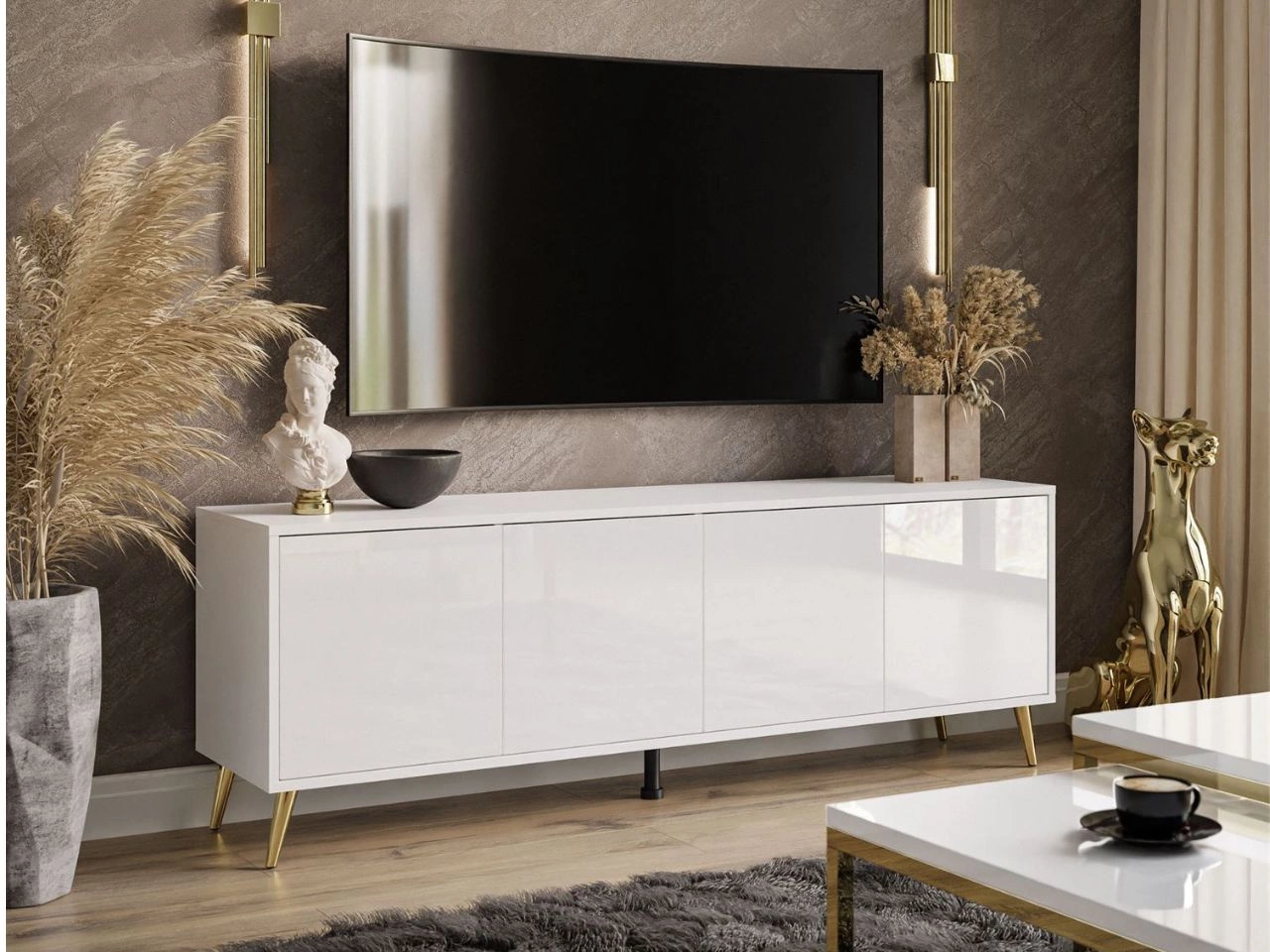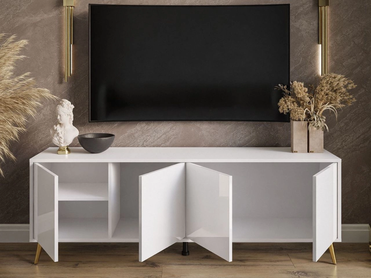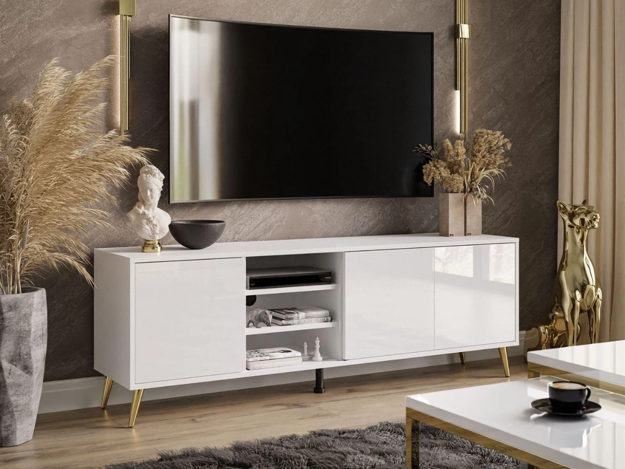 TV-Lowboard mit Türen goldene Beine Vivance Weiß Hochglanz