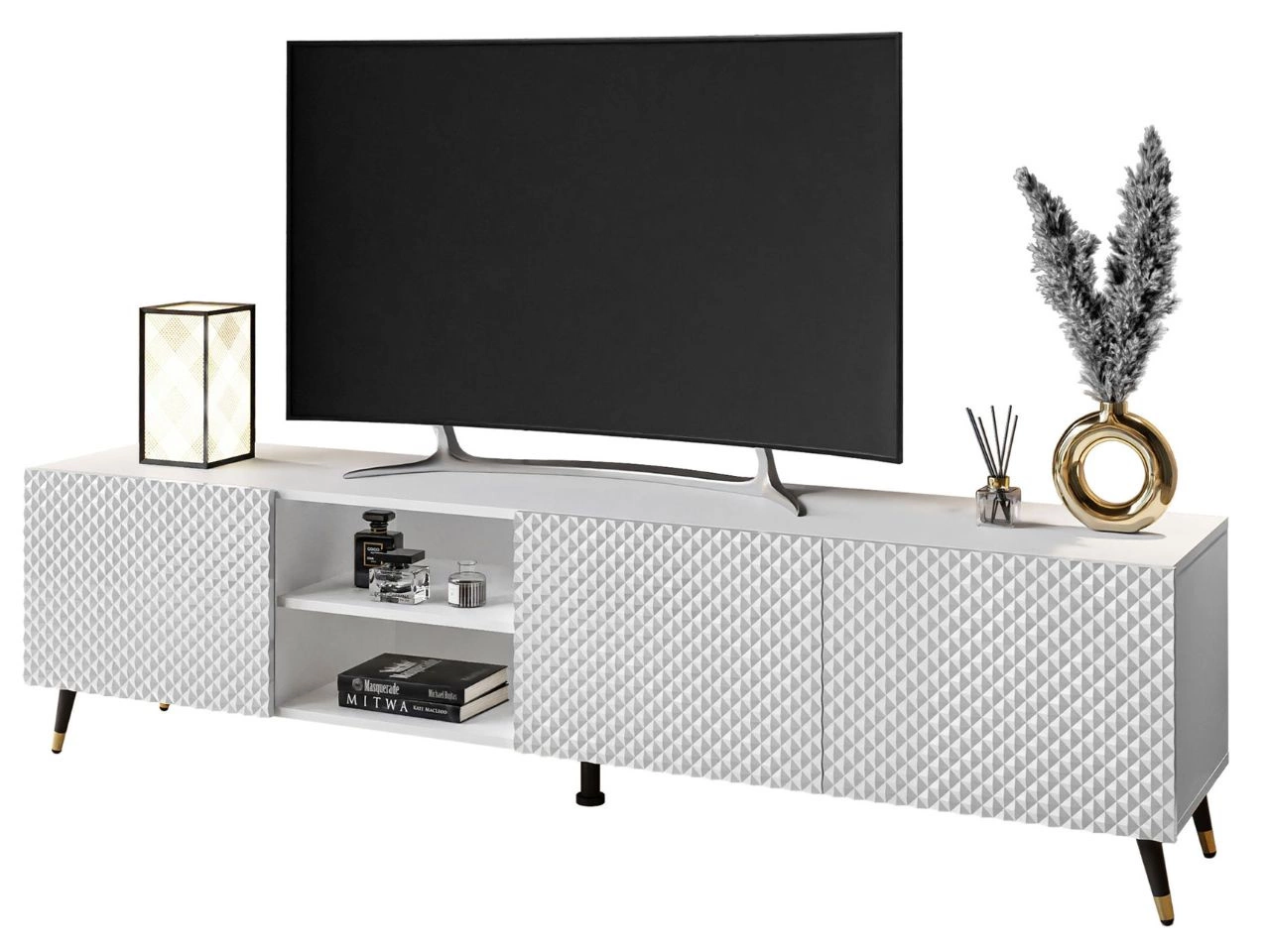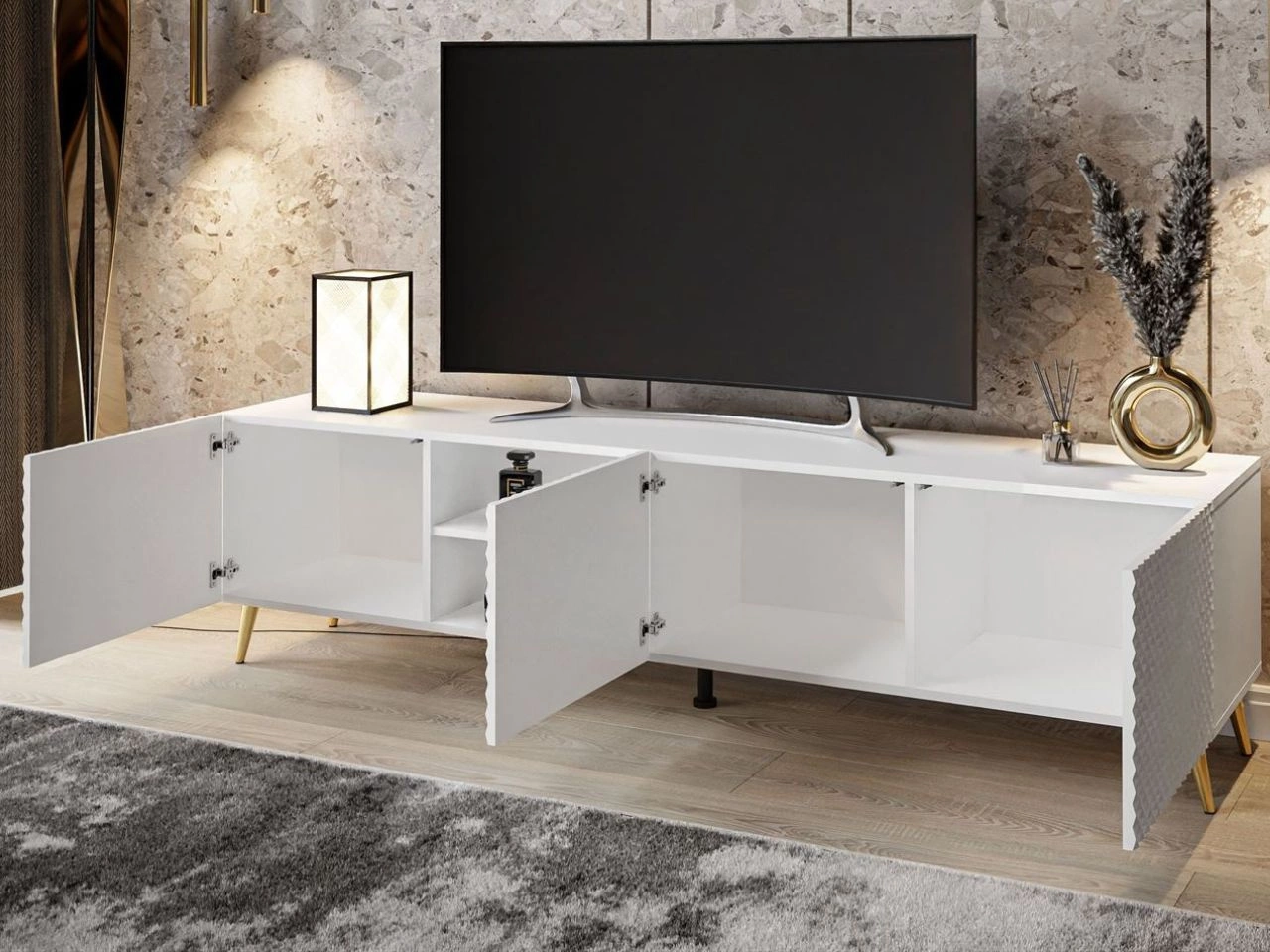 TV-Schrank mit 3D-gefrästen Fronten und schwarz-goldene Metallbeinen Celiane Weiß Glanz