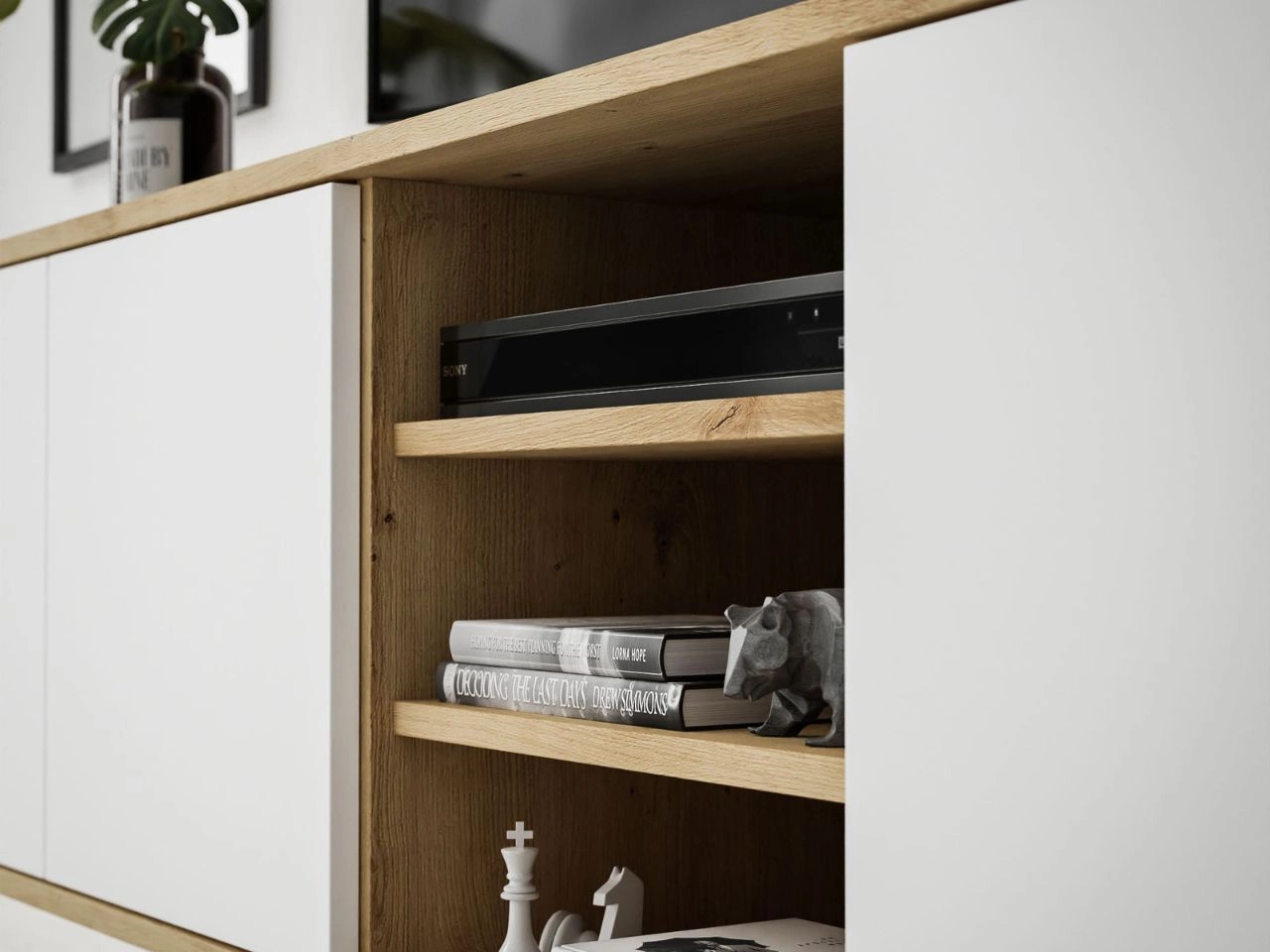 Das viertürige TV-Lowboard Vivance wurde so konzipiert, dass es sich an persönliche Vorlieben anpassen lässt. Was bedeutet das? Zum Möbel gehören vier Türfronten, die jedoch nicht alle montiert werden müssen. Die Konstruktion erlaubt es, im mittleren Bereich – links oder rechts – eine offene Nische mit Einlegeböden zu belassen. So erhalten Sie wahlweise ein vier- oder dreitüriges Lowboard. Das Möbel verfügt über zwei kleinere und eine größere Nische sowie drei Einlegeböden. Die Türen öffnen sich grifflos per Push-to-Open – drücken zum Öffnen.