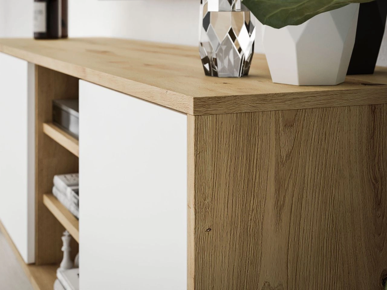 Das TV-Möbel Vivance wird aus hochwertiger laminierter Platte gefertigt; die Kanten sind mit einer ABS-Kante geschützt, die vor feinen Kratzern und mechanischen Beschädigungen bewahrt. In der Rückwand befindet sich eine runde Öffnung als Kabeldurchführung für eine saubere Kabelführung. Die Fronten sind in Mattweiß ausgeführt, der Korpus hat den Farbton Eiche Artisan. Das Ganze steht auf ästhetischen weißen Füßen aus Kunststoff.