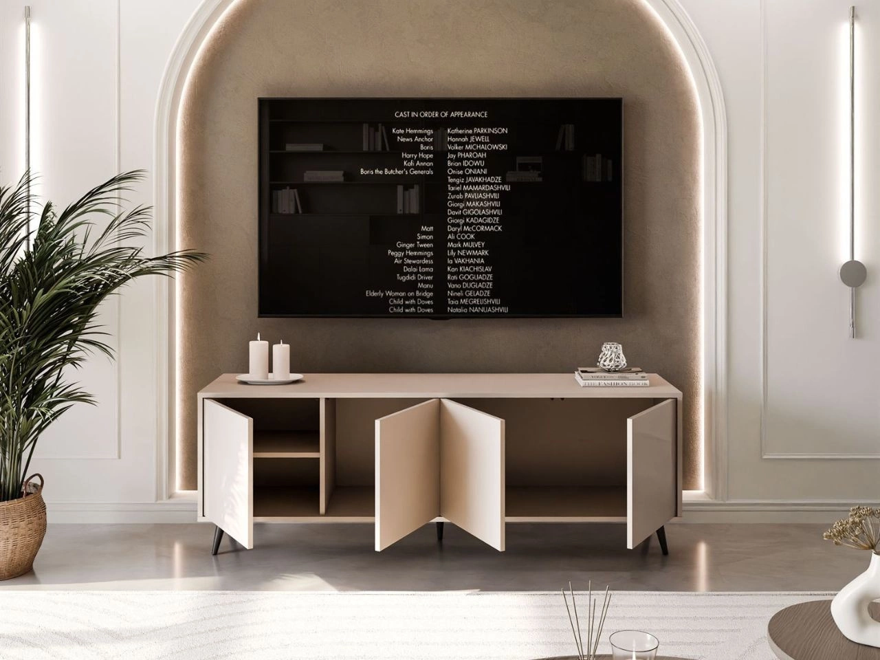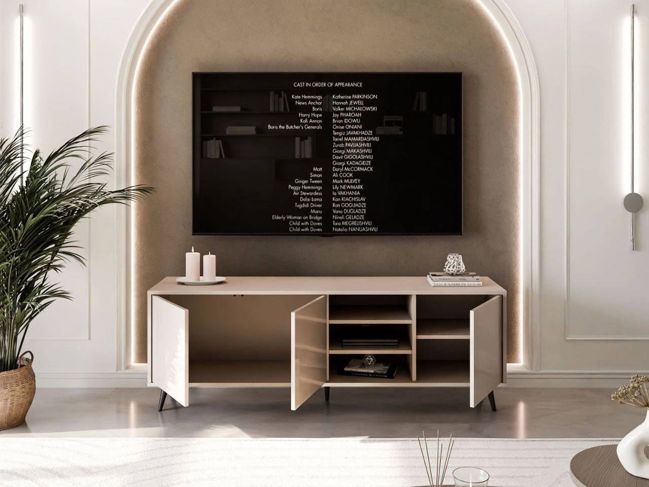 Das kaschmirfarbene, viertürige TV-Lowboard Vivance wurde so konzipiert, dass es sich an individuelle Vorlieben anpassen lässt. Was bedeutet das? Im Set erhalten Sie vier Türfronten, die jedoch nicht alle montiert werden müssen. Die Konstruktion erlaubt es, im mittleren Bereich – links oder rechts – ein offenes Fach mit Regalböden zu belassen. So kann das Lowboard vier- oder dreitürig genutzt werden. Das Möbel bietet zwei kleinere und ein größeres Fach sowie insgesamt drei Einlegeböden. Die Türen öffnen sich über ein griffloses Push-to-Open-System – drücken zum Öffnen.