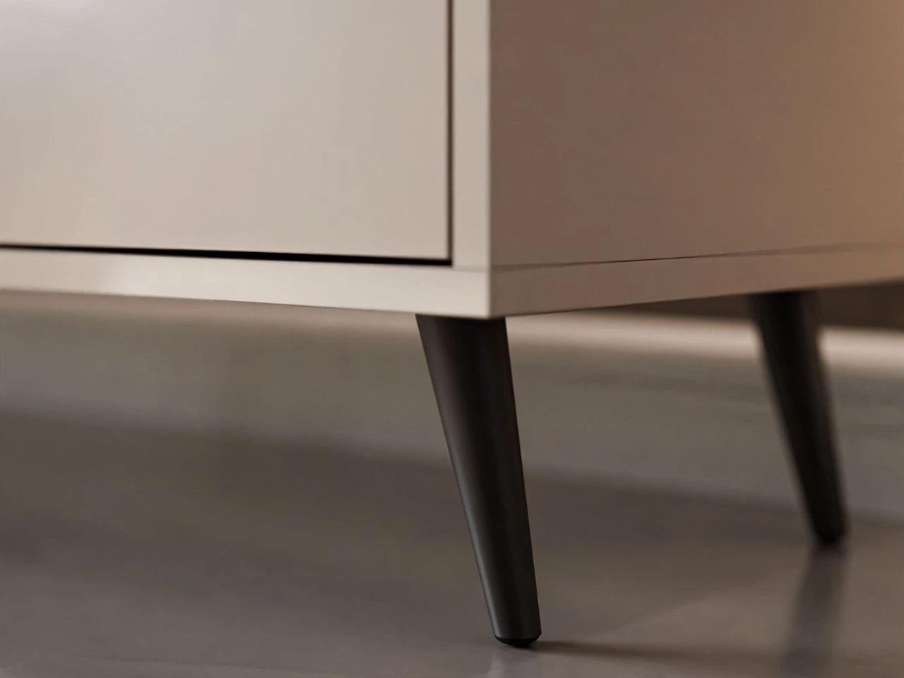 Das TV-Lowboard Vivance besteht aus einer hochwertigen laminierten Platte, deren Kanten mit ABS-Umleimer geschützt sind, was vor feinen Kratzern und mechanischen Beschädigungen schützt. In der Rückwand befindet sich eine runde Öffnung, die eine ordentliche Kabelführung nach außen ermöglicht. Die Fronten sind in Hochglanz ausgeführt, der Korpus hingegen in Matt. Das gesamte Möbel steht auf ästhetischen Metallfüßen.