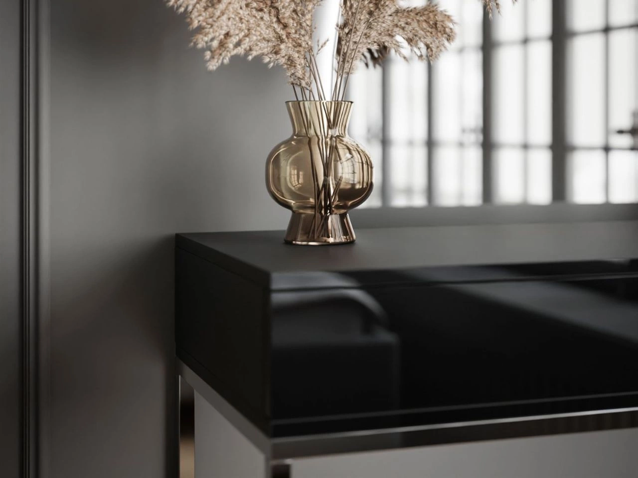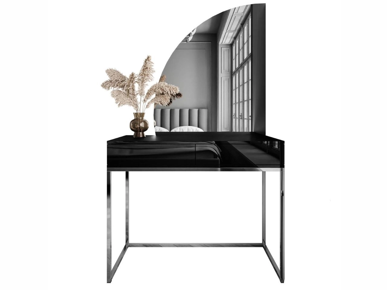 Kosmetiktisch linksseitig mit Schubladen und LED-Beleuchtung auf silbernen Beinen Clarette Schwarz Hochglanz