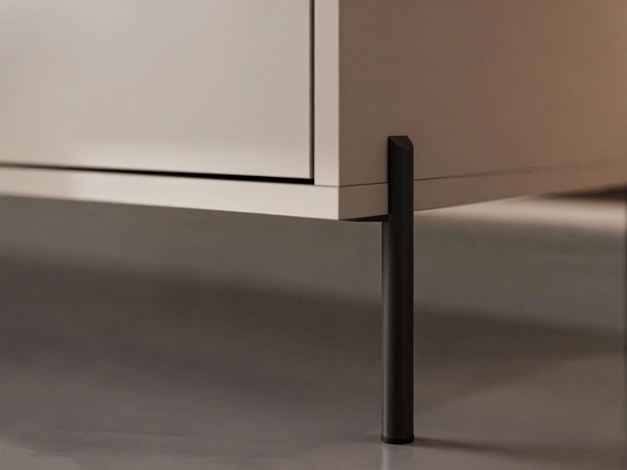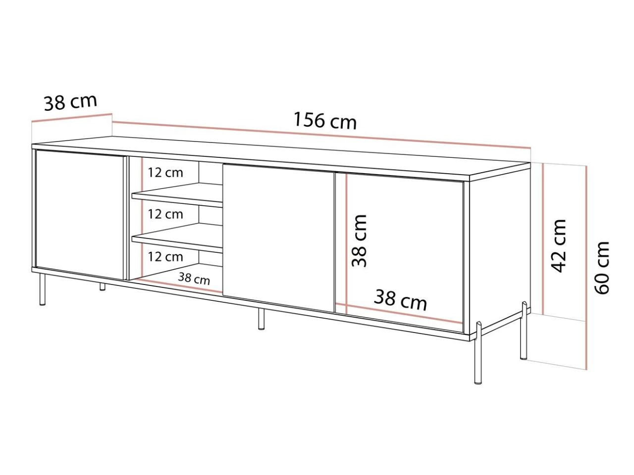 Das TV-Lowboard Vivance besteht aus einer hochwertigen laminierten Platte, deren Kanten mit ABS-Umleimer geschützt sind, was vor feinen Kratzern und mechanischen Beschädigungen schützt. In der Rückwand befindet sich eine runde Öffnung, die eine ordentliche Kabelführung nach außen ermöglicht. Die Fronten sind in Hochglanz ausgeführt, der Korpus hingegen in Matt. Das gesamte Möbel steht auf ästhetischen Metallfüßen.