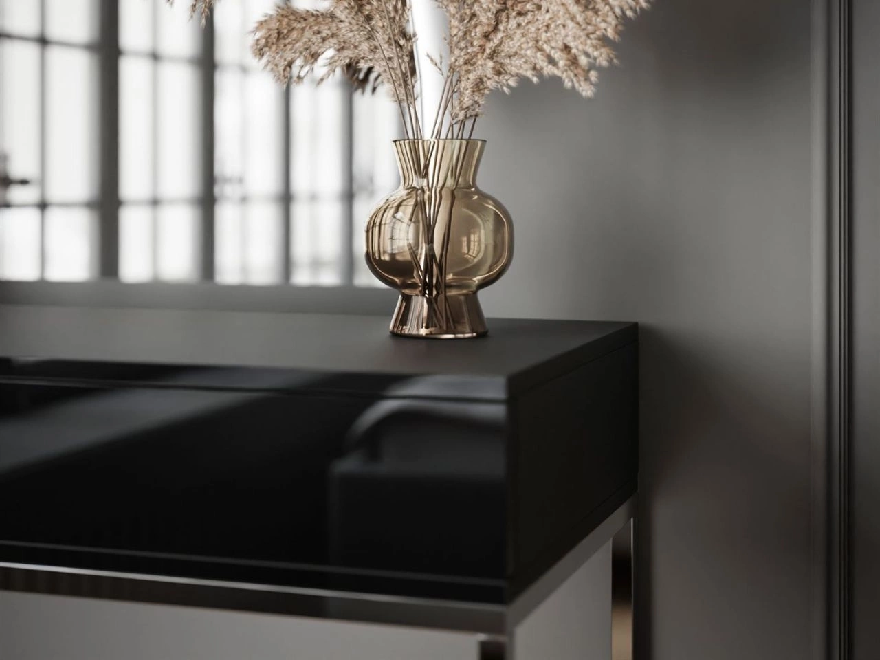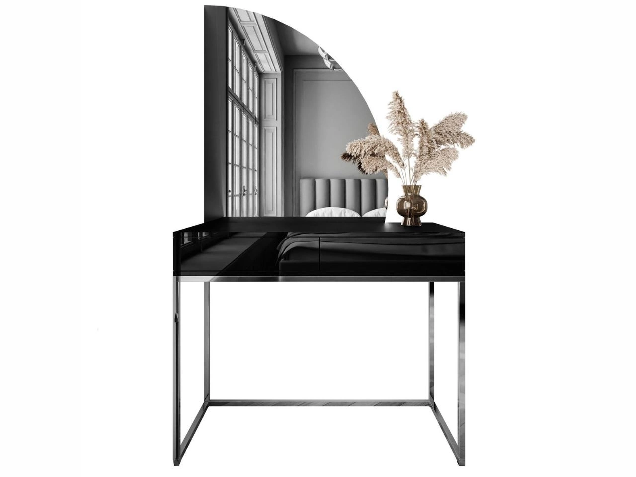 Kosmetiktisch rechtsseitig mit Schubladen und LED-Beleuchtung auf silbernen Beinen Clarette Schwarz Hochglanz