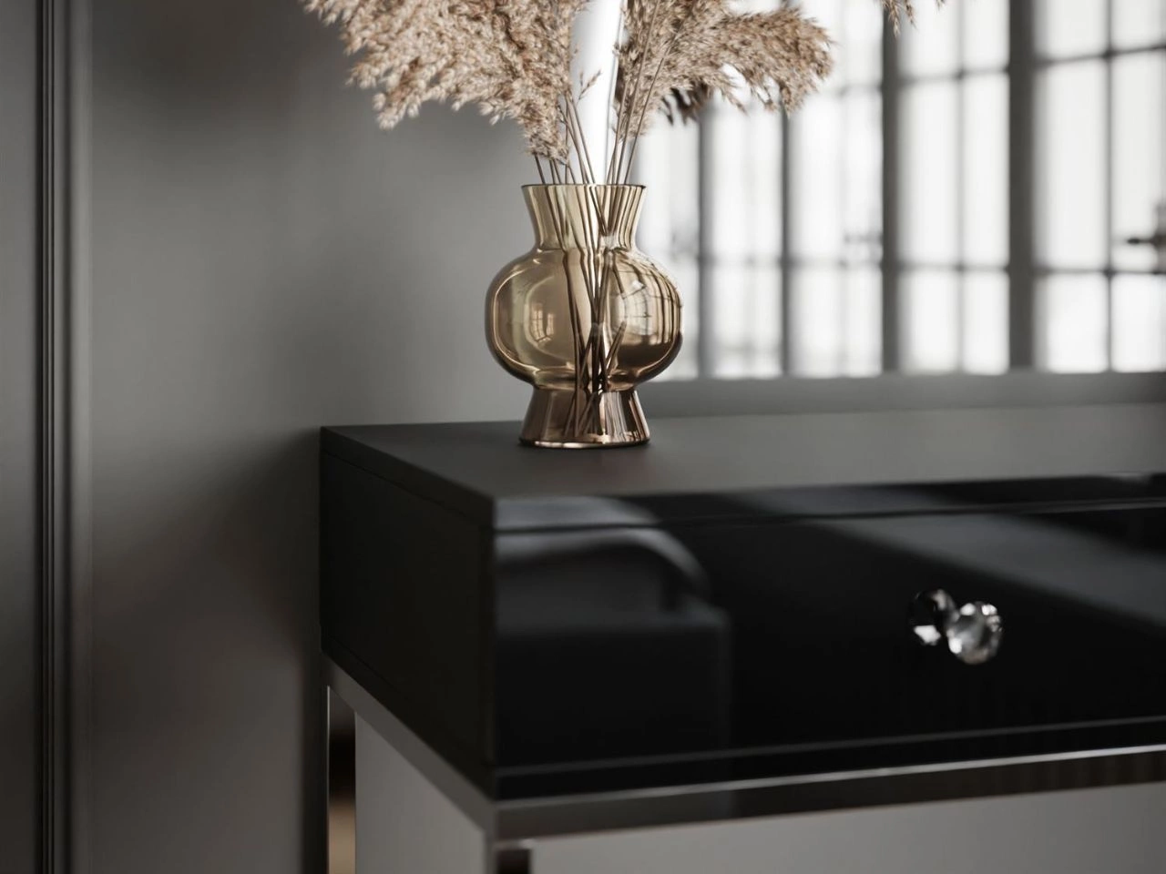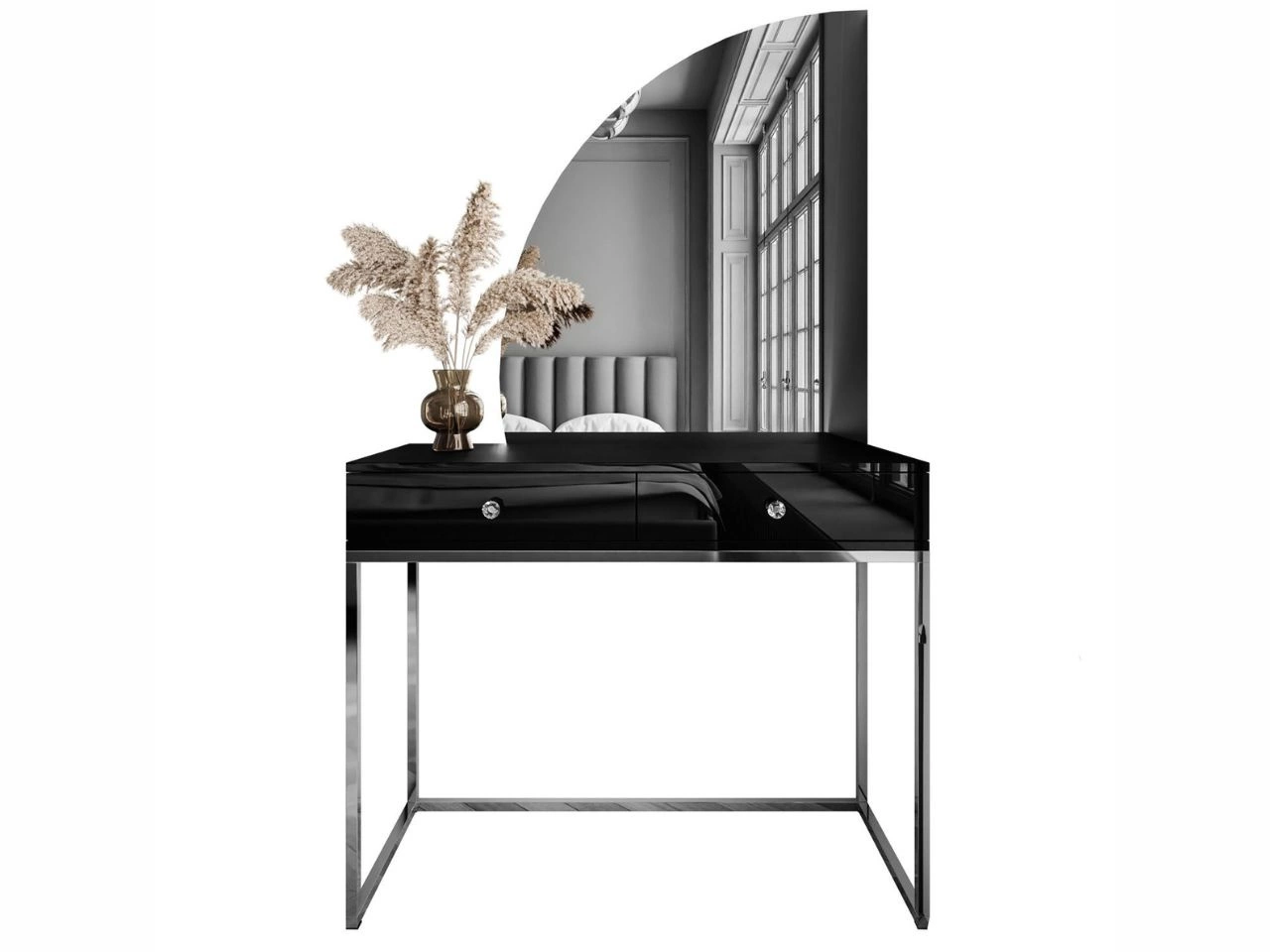 Ausgestattet mit zwei geräumigen Schubladen mit Kristallgriffen, die auf kugelgelagerten Vollauszügen laufen, ermöglicht der Toilettentisch Clarette die komfortable Aufbewahrung von Kosmetika, Accessoires und Kleinigkeiten und erleichtert die Ordnung. Das stabile Gestell in eleganter Ausführung unterstreicht die Leichtigkeit der Konstruktion und bringt zugleich eine Note von Luxus und Harmonie in den Raum. Die ideale Wahl für alle, die Ästhetik mit Funktionalität verbinden möchten.