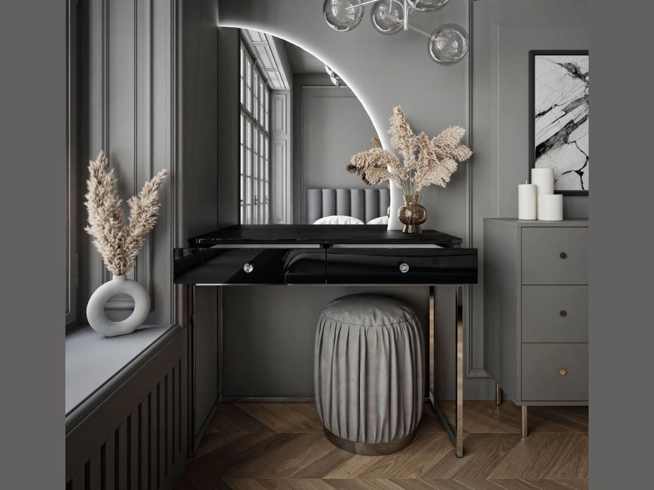 Ausgestattet mit zwei geräumigen Schubladen mit Kristallgriffen, die auf kugelgelagerten Vollauszügen laufen, ermöglicht der Toilettentisch Clarette die komfortable Aufbewahrung von Kosmetika, Accessoires und Kleinigkeiten und erleichtert die Ordnung. Das stabile Gestell in eleganter Ausführung unterstreicht die Leichtigkeit der Konstruktion und bringt zugleich eine Note von Luxus und Harmonie in den Raum. Die ideale Wahl für alle, die Ästhetik mit Funktionalität verbinden möchten.