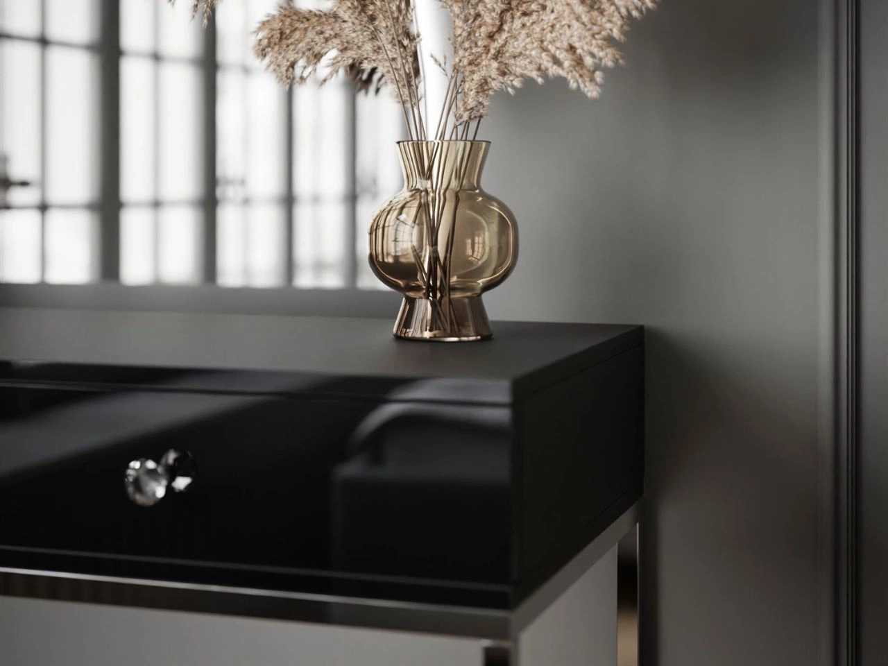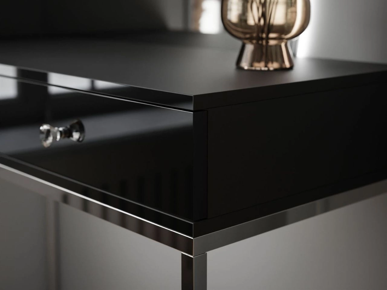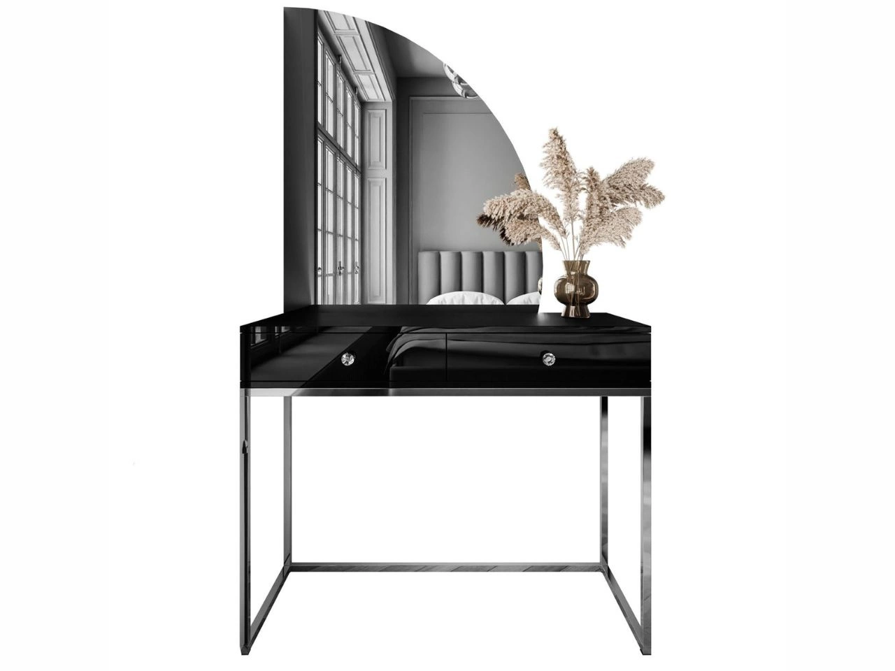 Kosmetiktisch rechtsseitig mit Schubladen und LED-Beleuchtung auf silbernen Beinen Clarette Schwarz Hochglanz
