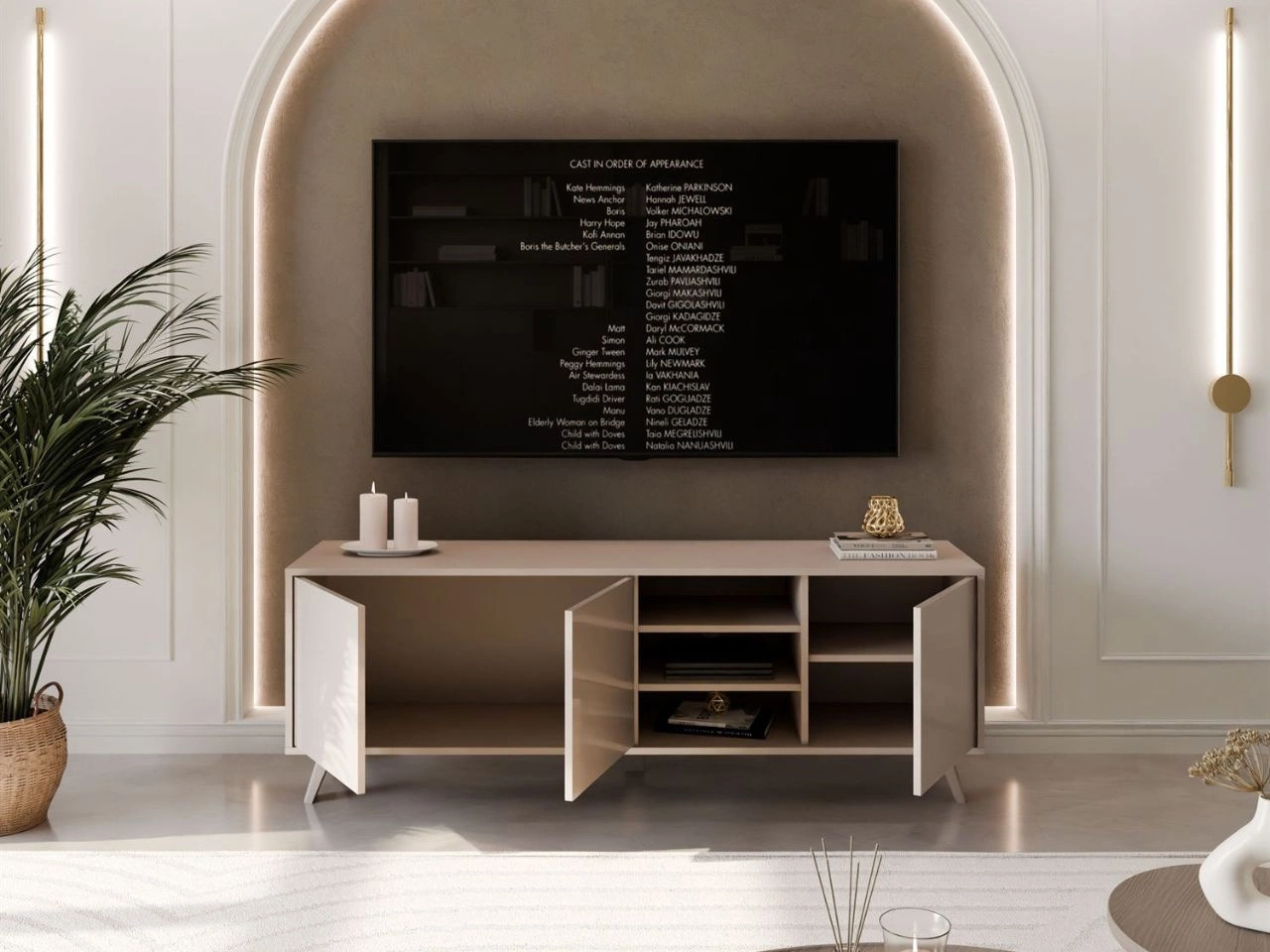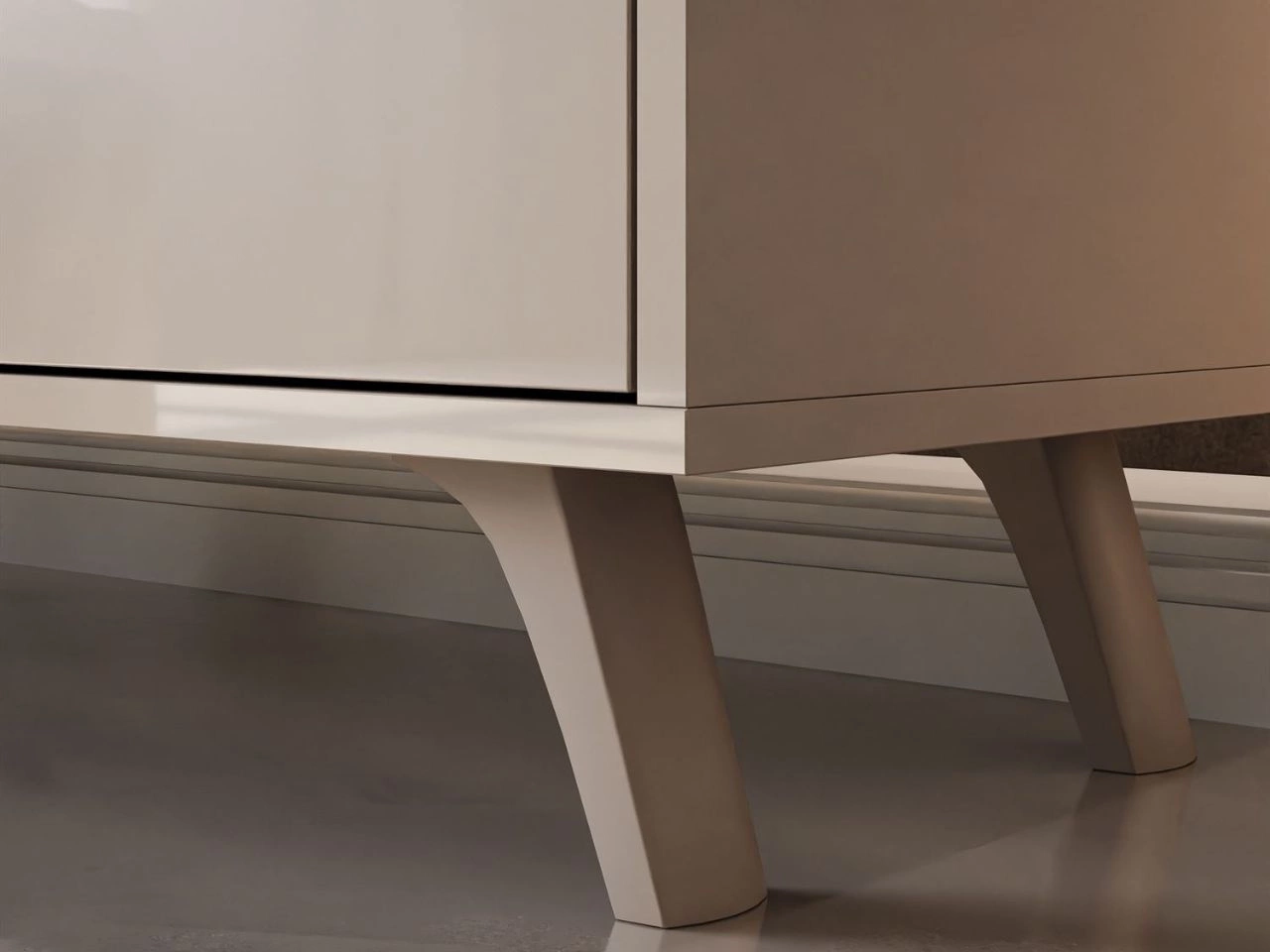 Das TV-Lowboard Vivance wird aus einer hochwertigen laminierten Platte gefertigt, deren Kanten mit einer ABS-Kante geschützt sind – das beugt feinen Kratzern und mechanischen Beschädigungen vor. In der Rückwand wurde eine runde Öffnung ausgeschnitten, die eine ordentliche Kabelführung nach außen ermöglicht. Die Fronten sind in Hochglanz ausgeführt, der Korpus hingegen in Matt. Das gesamte Möbel steht auf ästhetischen kaschmirfarbenen Kunststofffüßen.