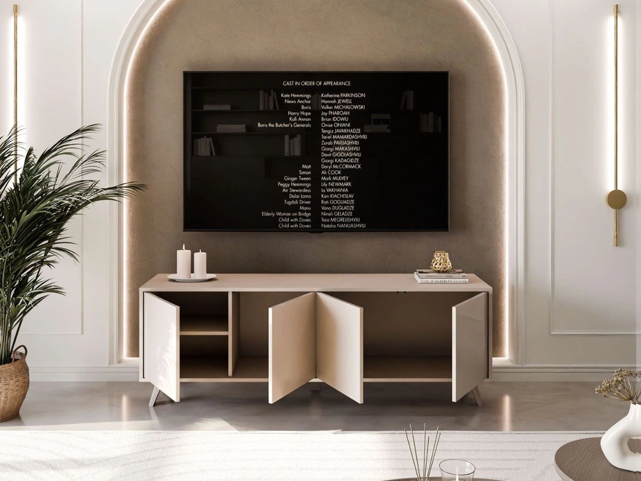 Das kaschmirfarbene, viertürige TV-Lowboard Vivance wurde so entworfen, dass es sich an individuelle Vorlieben anpassen lässt. Was bedeutet das? Mit dem Möbel erhalten Sie vier Türfronten, die jedoch nicht alle montiert werden müssen. Die Konstruktion des Möbelstücks erlaubt es, im mittleren Bereich – links oder rechts – eine offene Nische mit Böden zu belassen. So kann das Lowboard vier- oder dreitürig genutzt werden. Das Möbel verfügt über zwei kleinere und ein größeres Fach. Außerdem gibt es drei Einlegeböden. Die Türen öffnen sich über ein griffloses Push-to-Open-System – drücken zum Öffnen.