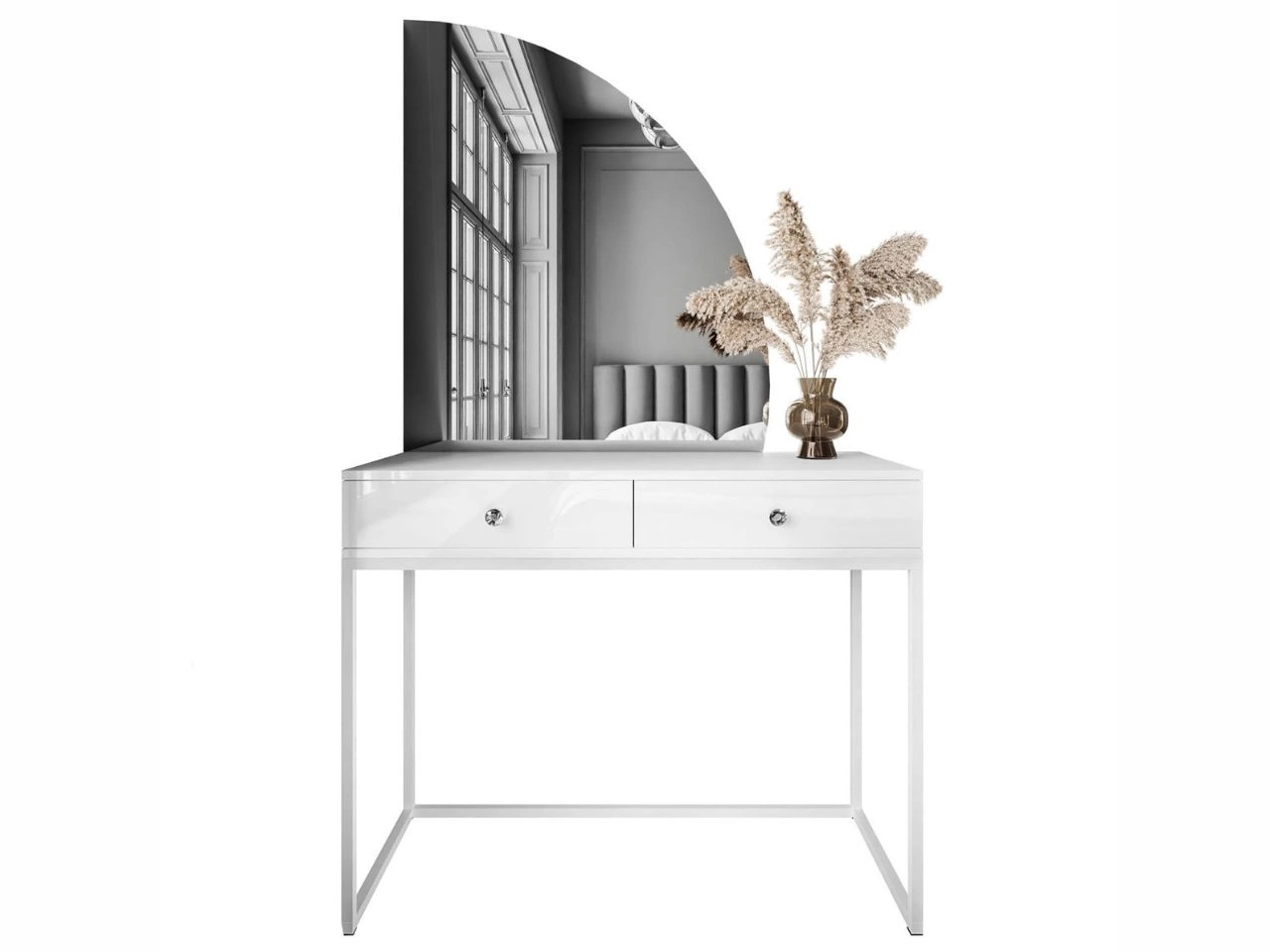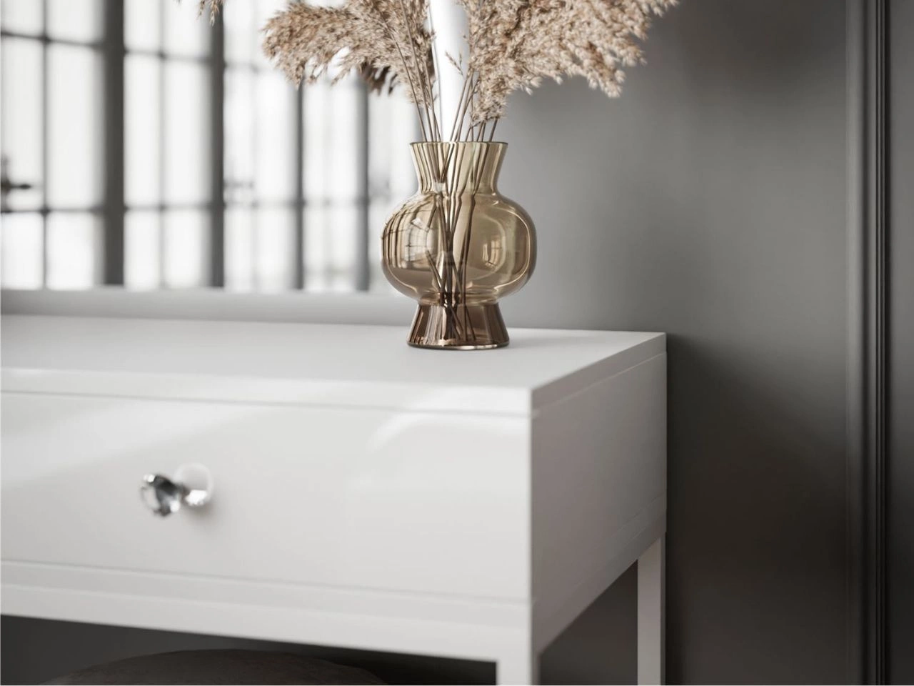 Ausgestattet mit zwei geräumigen Schubladen mit Kristallgriffen, die auf kugelgelagerten Vollauszügen laufen, ermöglicht der Toilettentisch Clarette die komfortable Aufbewahrung von Kosmetika, Accessoires und Kleinigkeiten und erleichtert die Ordnung. Das stabile Gestell in eleganter Ausführung unterstreicht die Leichtigkeit der Konstruktion und bringt zugleich eine Note von Luxus und Harmonie in den Raum. Die ideale Wahl für alle, die Ästhetik mit Funktionalität verbinden möchten.