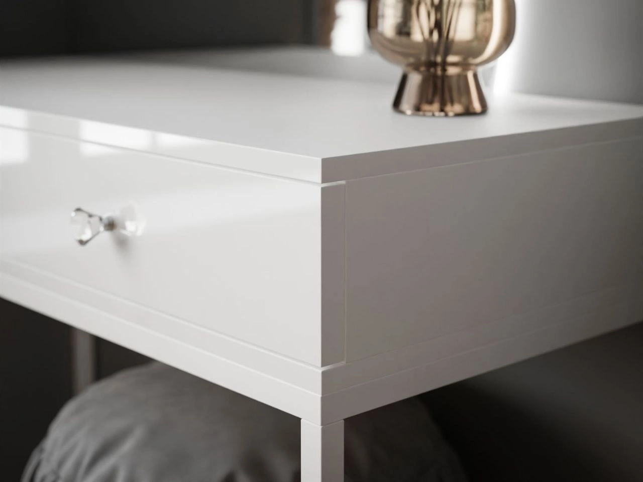 Kosmetiktisch rechtsseitig mit Schubladen und LED-Beleuchtung auf weißen Beinen Clarette Weiß Hochglanz