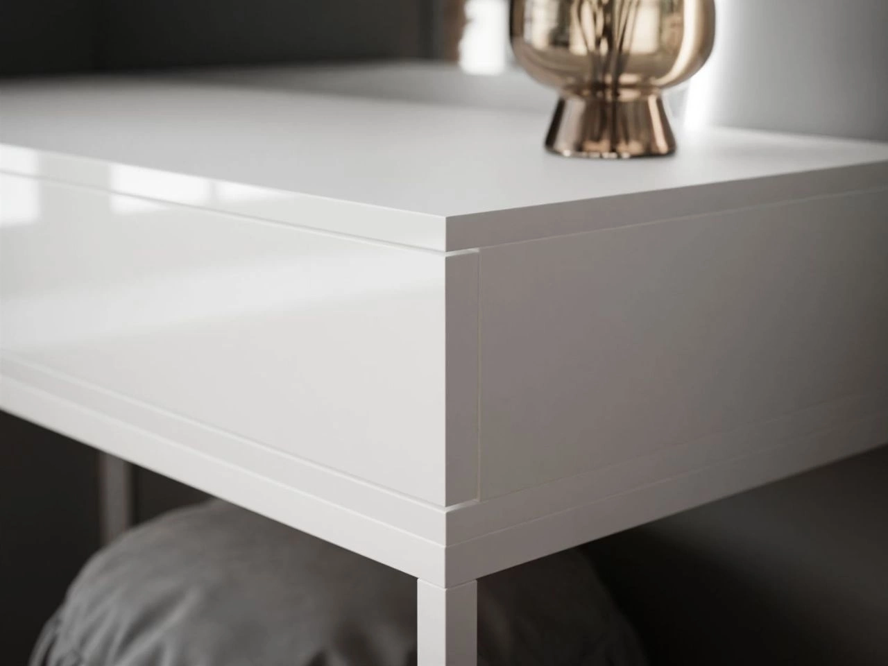 Kosmetiktisch rechtsseitig mit Schubladen und LED-Beleuchtung auf weißen Beinen Clarette Weiß Hochglanz