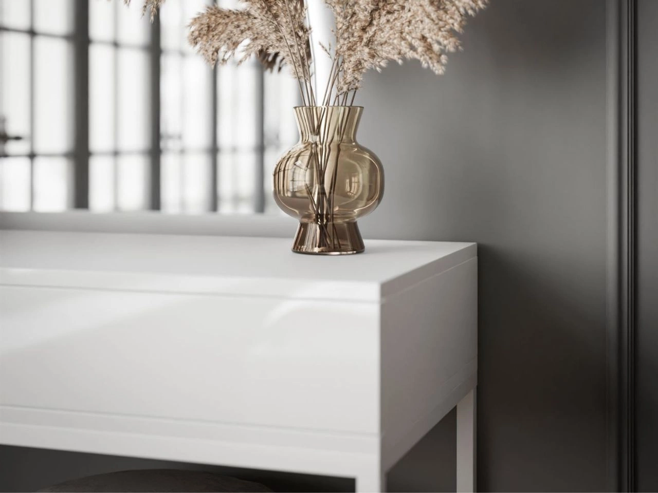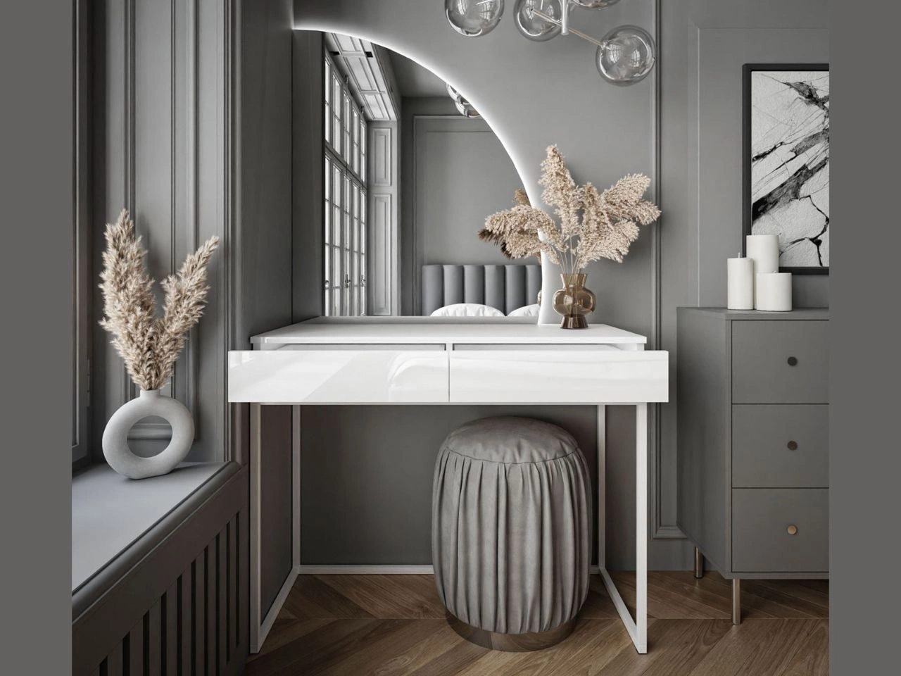 Ein charakteristisches Element des Sets ist der Eckspiegel mit rechten Abrundung, ausgestattet mit einer energiesparenden LED-Beleuchtung. Die neutrale Lichtfarbe sorgt für Komfort und eine naturgetreue Farbwiedergabe, wodurch tägliche Pflege- und Make-up-Routinen noch angenehmer werden. Dank der einfachen Montage ist der Toilettentisch Clarette nicht nur ein stilvolles, sondern auch ein äußerst praktisches Möbelstück für jedes Schlafzimmer oder Ankleidezimmer.