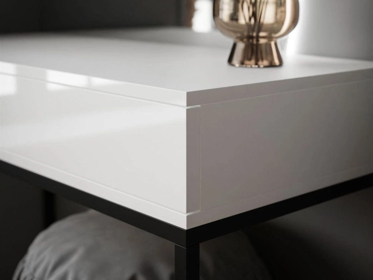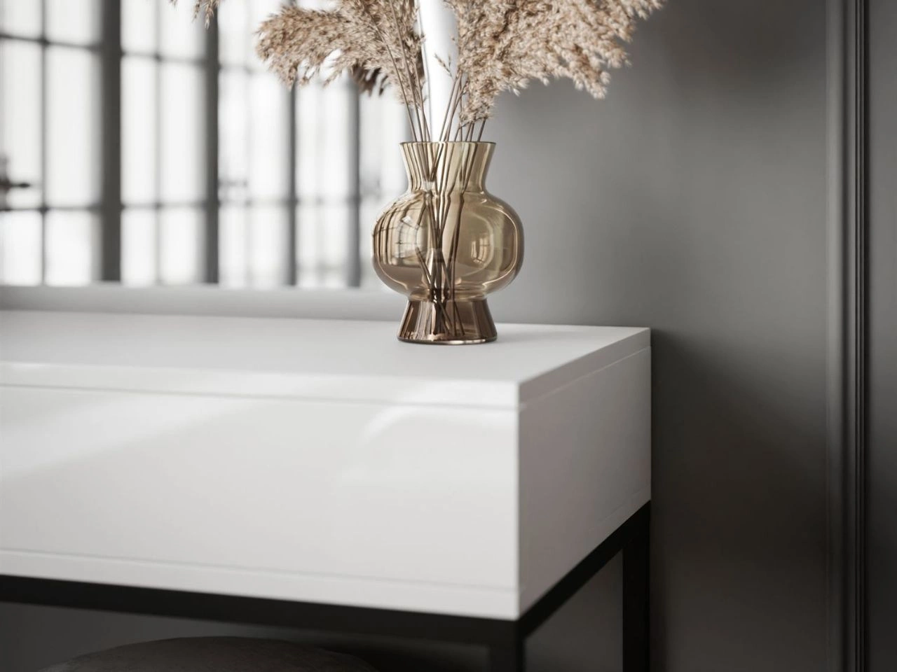 Kosmetiktisch rechtsseitig mit Schubladen und LED-Beleuchtung auf schwarzen Beinen Clarette Weiß Hochglanz
