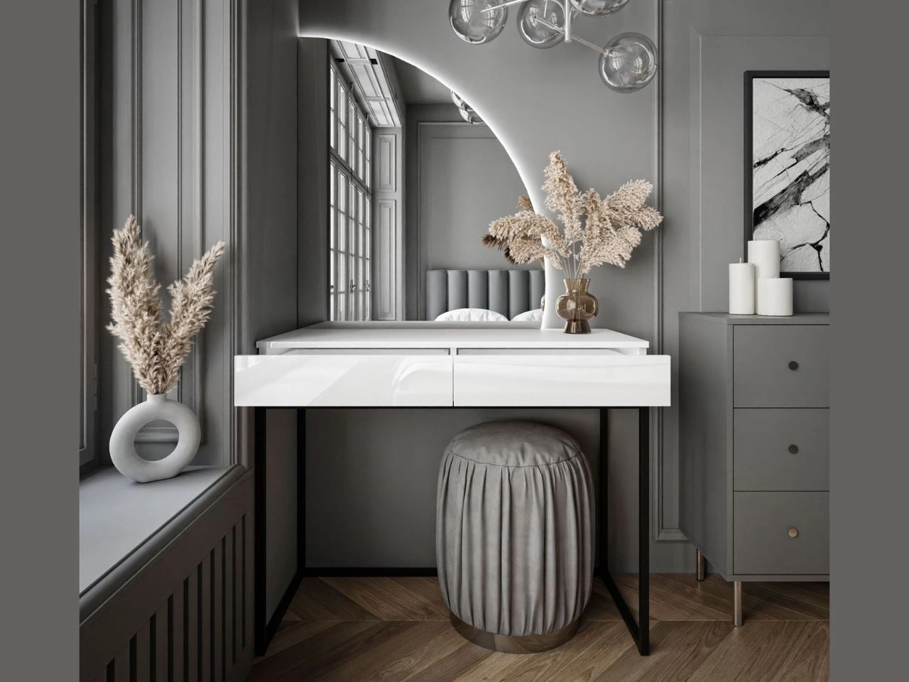 Suchen Sie ein Möbelstück, das Eleganz, Funktionalität und modernen Charakter vereint? Die Toilettentisch Clarette mit Spiegel und LED-Beleuchtung ist die ideale Lösung für alle, die minimalistisches Design und praktische Details schätzen. Ihre subtile Form und dekorative Verarbeitung machen sie perfekt für moderne, glamouröse oder skandinavische Einrichtungen und verleihen dem Raum einen einzigartigen Stil.
