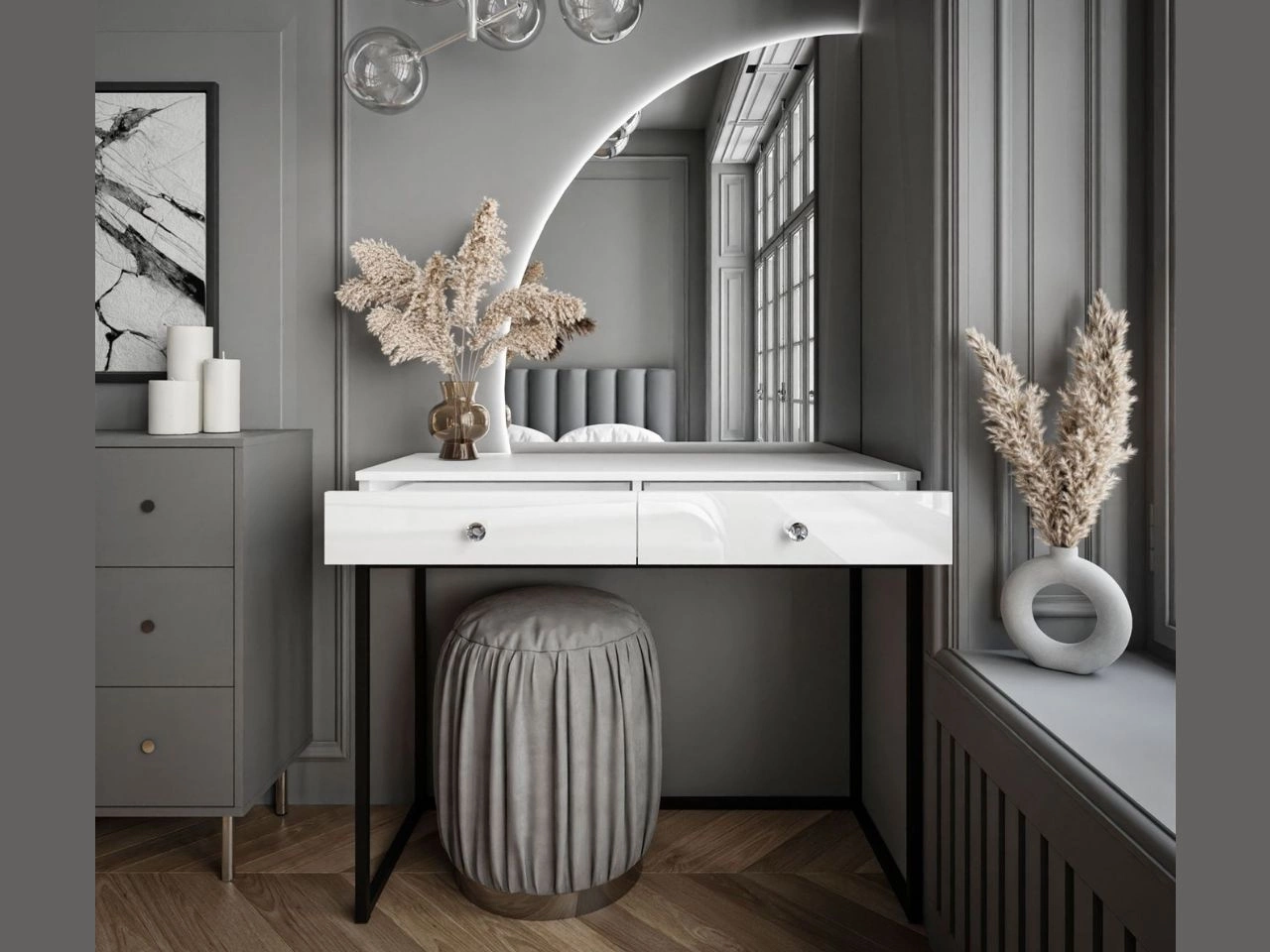 Suchen Sie ein Möbelstück, das Eleganz, Funktionalität und modernen Charakter vereint? Die Toilettentisch Clarette mit Spiegel und LED-Beleuchtung ist die ideale Lösung für alle, die minimalistisches Design und praktische Details schätzen. Ihre subtile Form und dekorative Verarbeitung machen sie perfekt für moderne, glamouröse oder skandinavische Einrichtungen und verleihen dem Raum einen einzigartigen Stil.