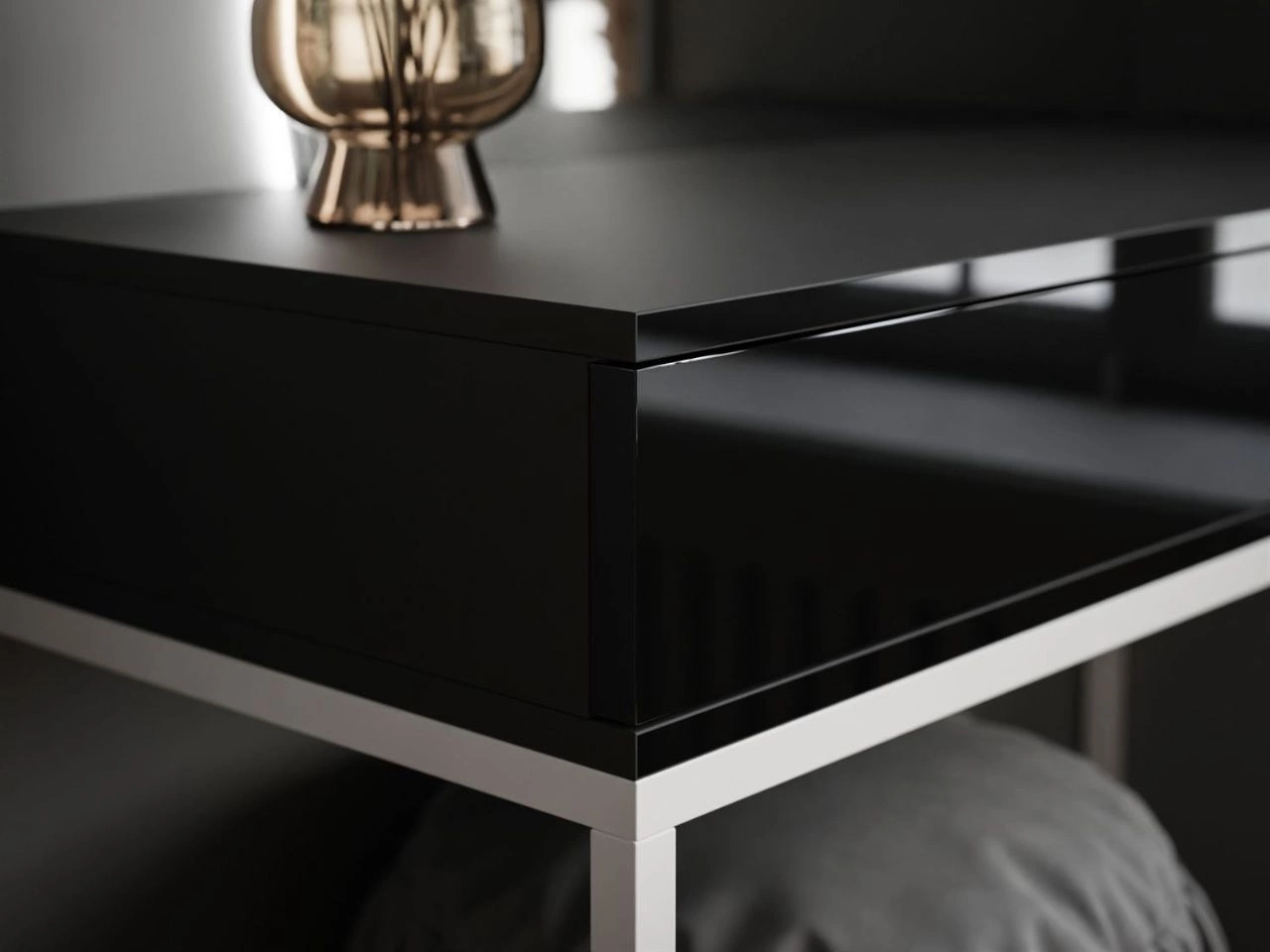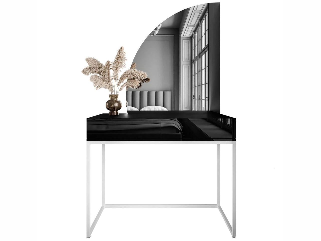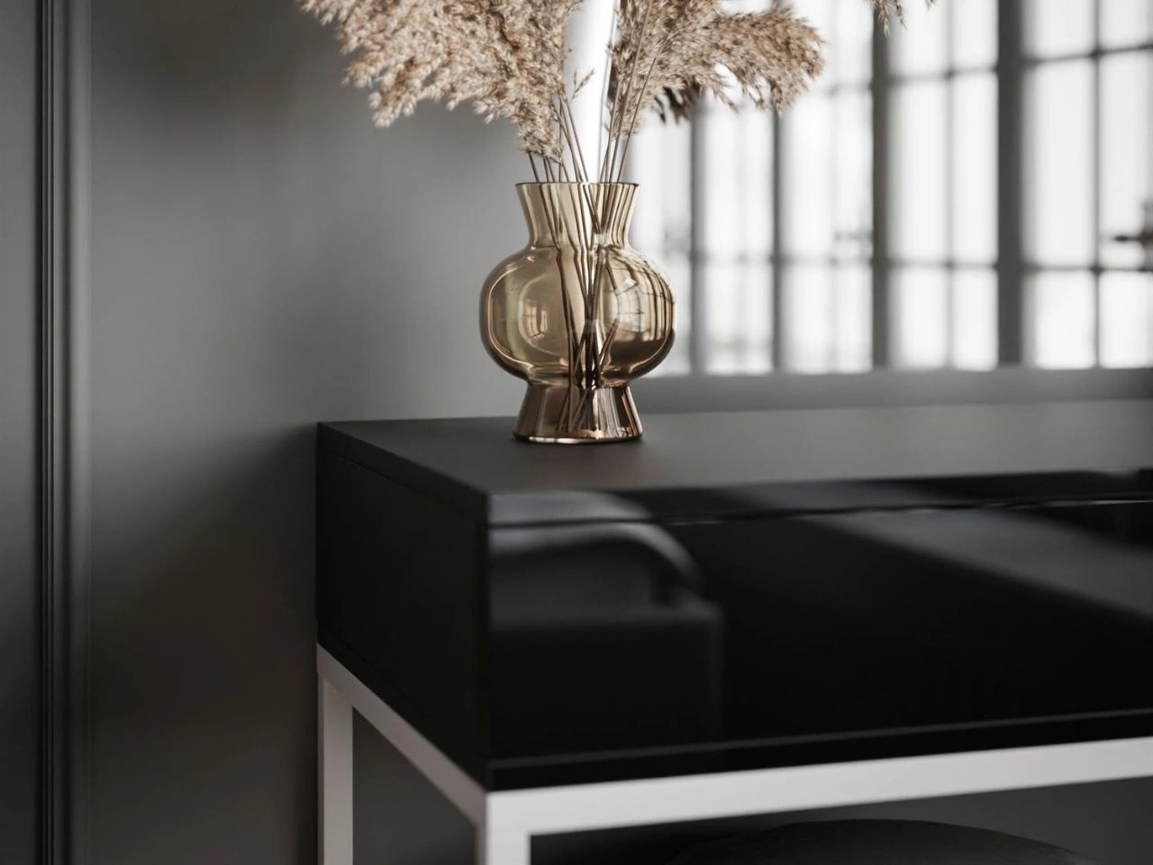 Kosmetiktisch linksseitig mit Schubladen und LED-Beleuchtung auf weißen Beinen Clarette Schwarz Hochglanz