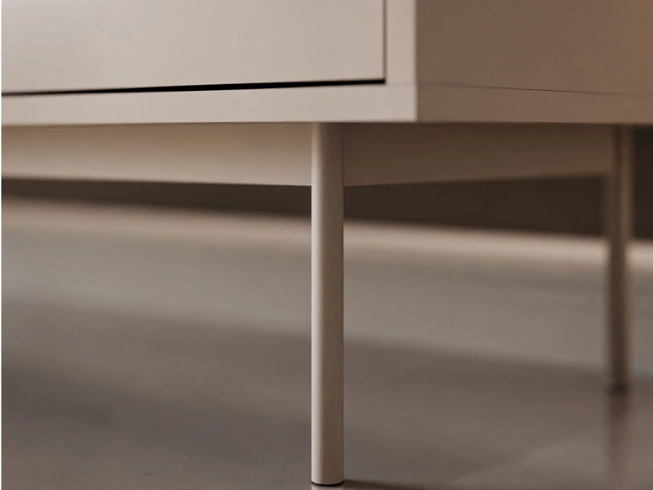 Die Kommode Vivance besitzt Fronten in Hochglanz, während der Korpus in einem dezenten Matt gehalten ist. Der Korpus steht auf metallenen Beinen in Kaschmir. Zusätzlich gibt es einen zentralen Stützfuß, der die Konstruktion stabilisiert und zu einer gleichmäßigen Lastverteilung beiträgt.