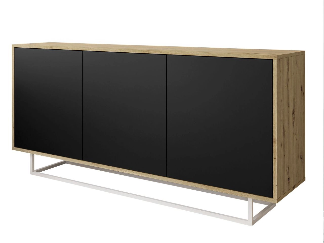 Dreitürige Kommode 154 cm im Loft-Stil auf weißem Gestell – Vivance, Schwarz matt & Eiche Artisan