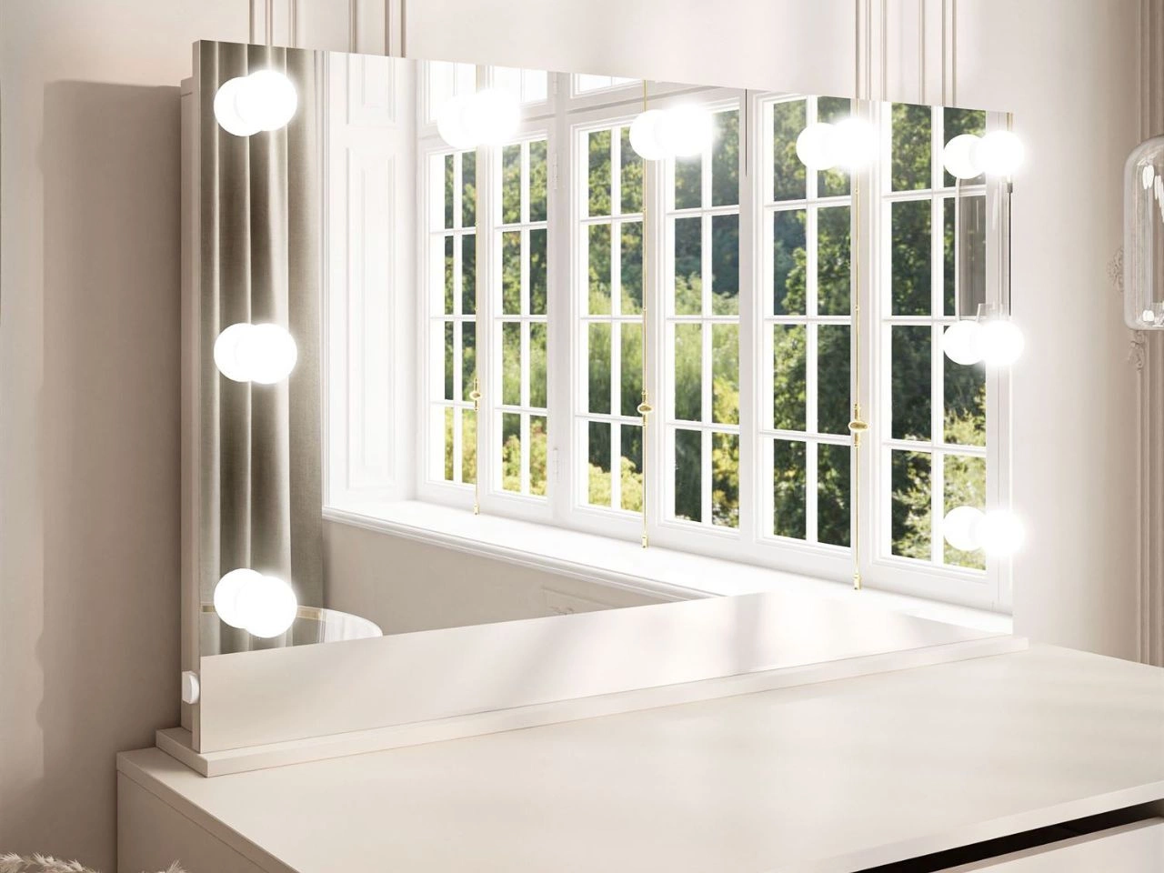 Der Spiegel Melo Elite ist mit neun LED-Leuchtmitteln ausgestattet, die ein natürliches, augenschonendes Licht spenden. Die Lampen werden über das Stromnetz mithilfe des im Set enthaltenen Kabels betrieben. Der Lichtschalter befindet sich gut erreichbar auf der linken Seite. Die Spiegelfläche ist auf einer soliden Basis aus hochwertiger laminierter Platte montiert. Um Kratzer und kleine mechanische Beschädigungen zu vermeiden, sind die Kanten zusätzlich mit ABS-Kante geschützt. Diese schützt auch vor Feuchtigkeit, wodurch sich der Melo Elite Spiegel ideal auch für das Badezimmer eignet. Das Modell lässt sich zudem perfekt mit dem passenden Schreibtisch derselben Serie kombinieren.