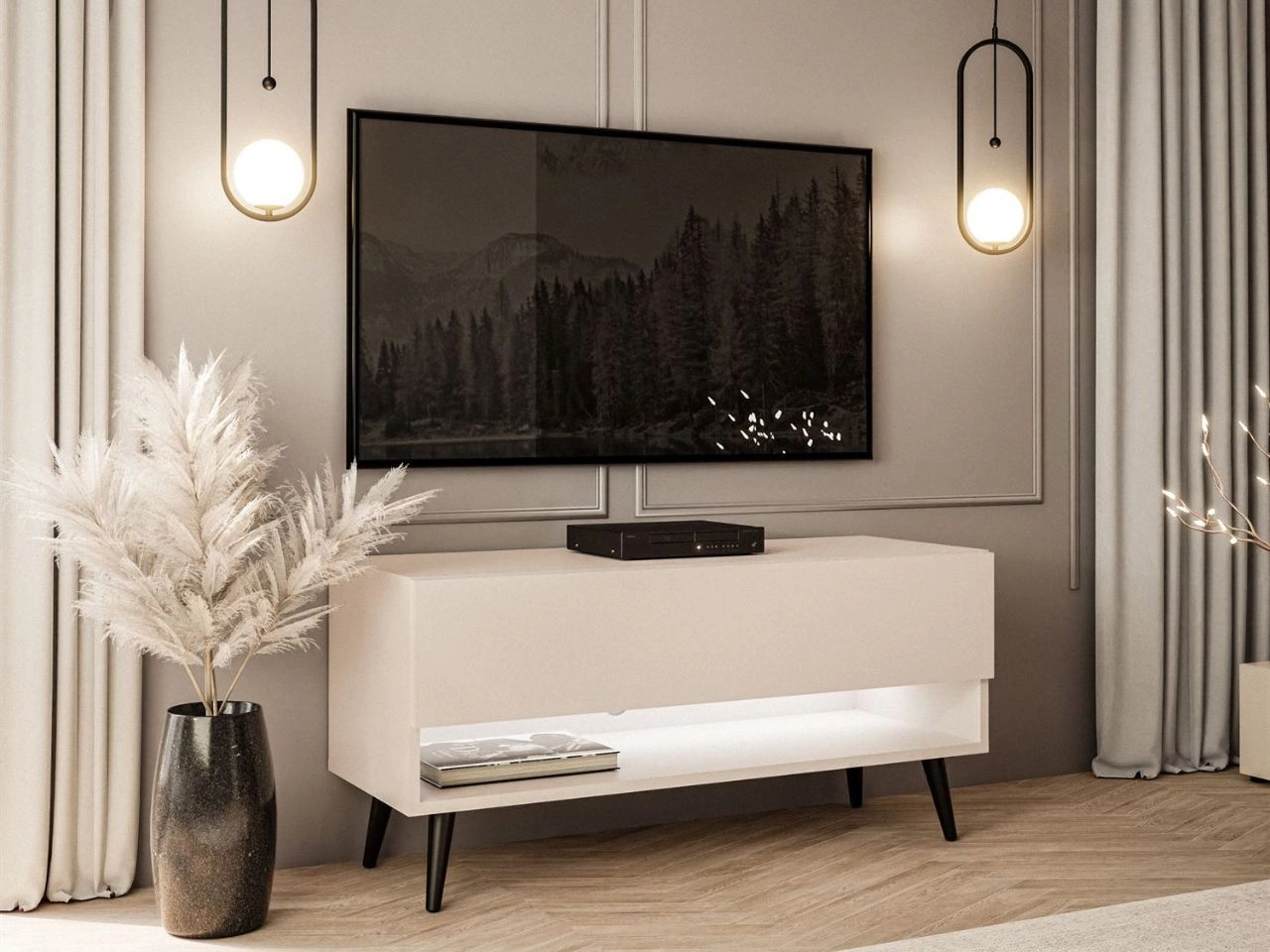 TV-Schrank 90 cm mit LED-Beleuchtung und schwarzen Beinen Aurelie Kaschmir matt